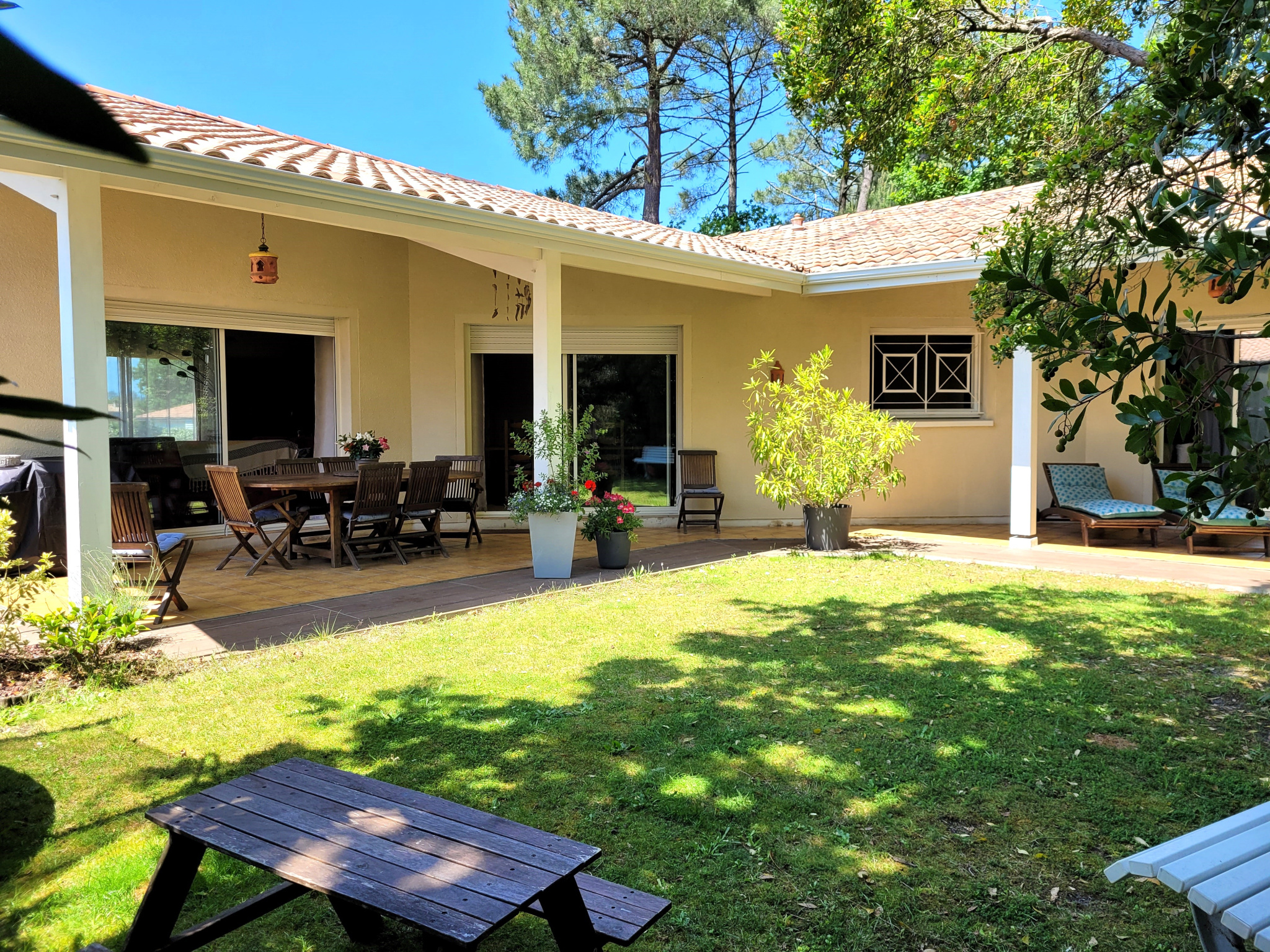 A Cazaux, Maison de plain-pied construite en 2016, d'une surface habitable de 119m2, séjour de 49m2 avec cuisine ouverte, cellier, 3 chambres dont une suite parentale avec dressing et salle d'eau, salle de bains. En extérieur, terrasse en bois exotiq...