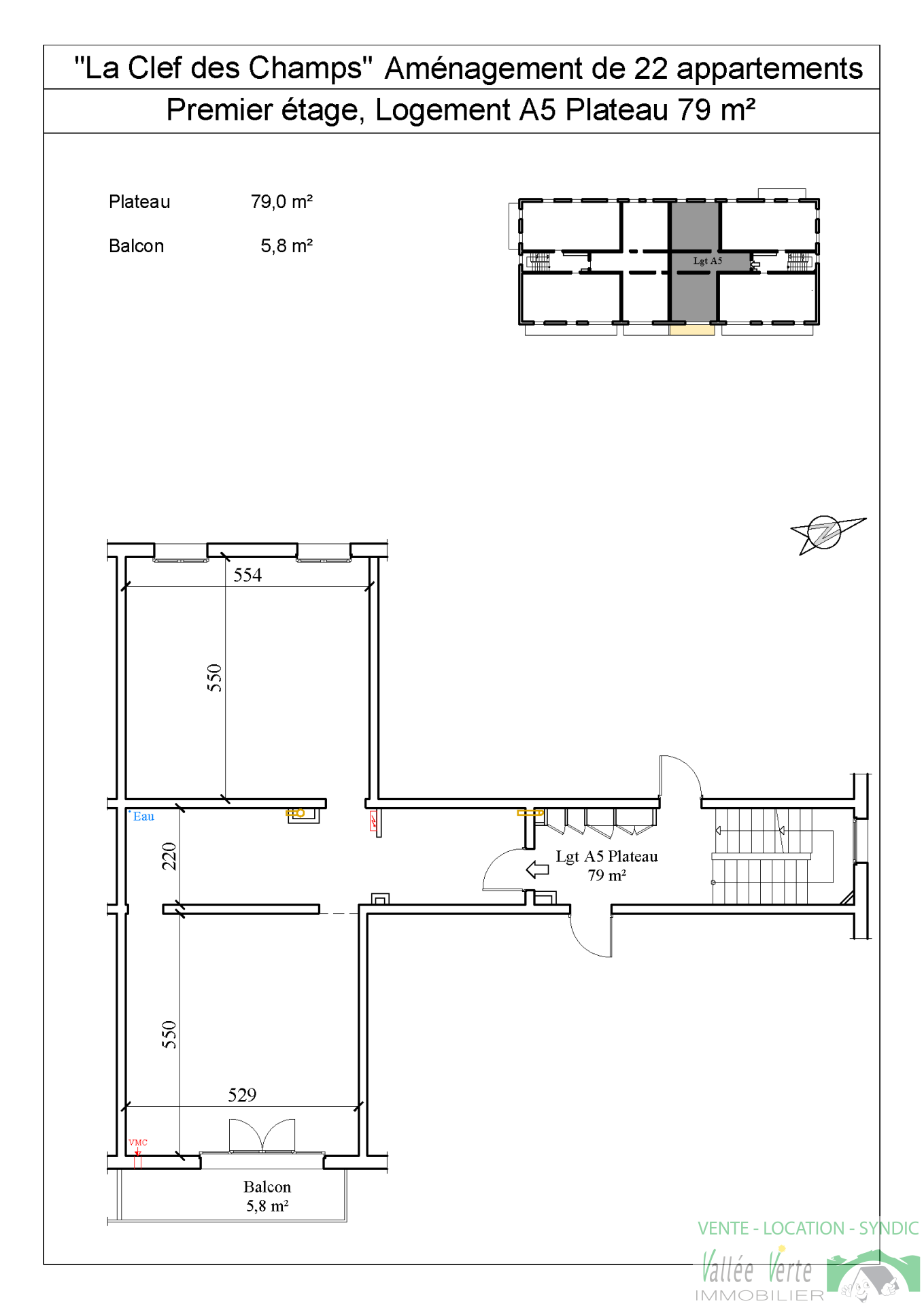 Dans un ensemble immobilier de 22 logements/plateaux sur les hauteurs de Saint-Jeoire, Plateau type T3 au 1er étage d'une surface de 79 m2 + Balcon de 5.80 m2 et une place de parking.