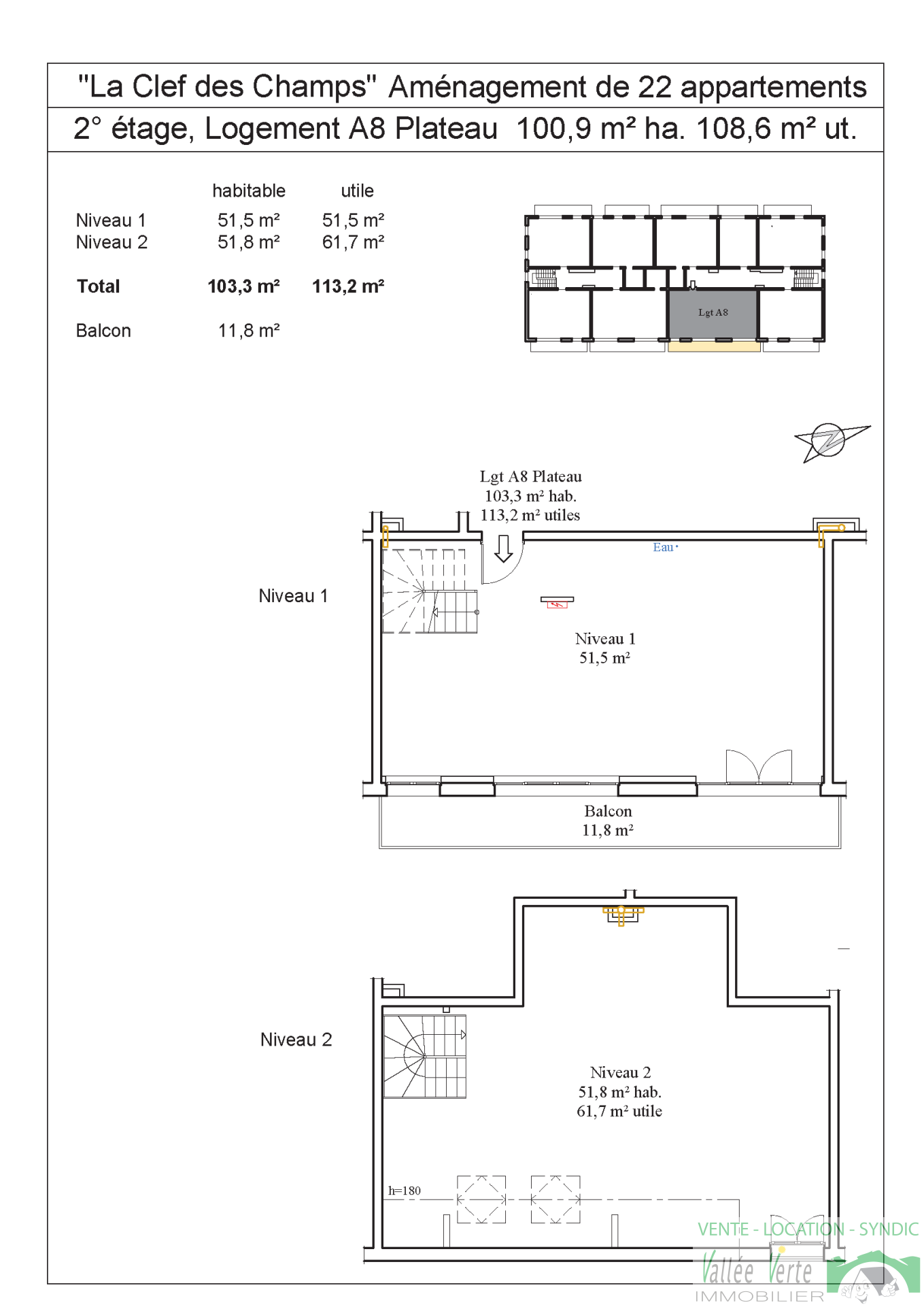 Dans un ensemble immobilier de 22 logements/plateaux sur les hauteurs de Saint-Jeoire, Plateau type T4 au 2ème étage d'une surface de 103.30 m2 + Balcon de 11.80 m2 et une place de parking.