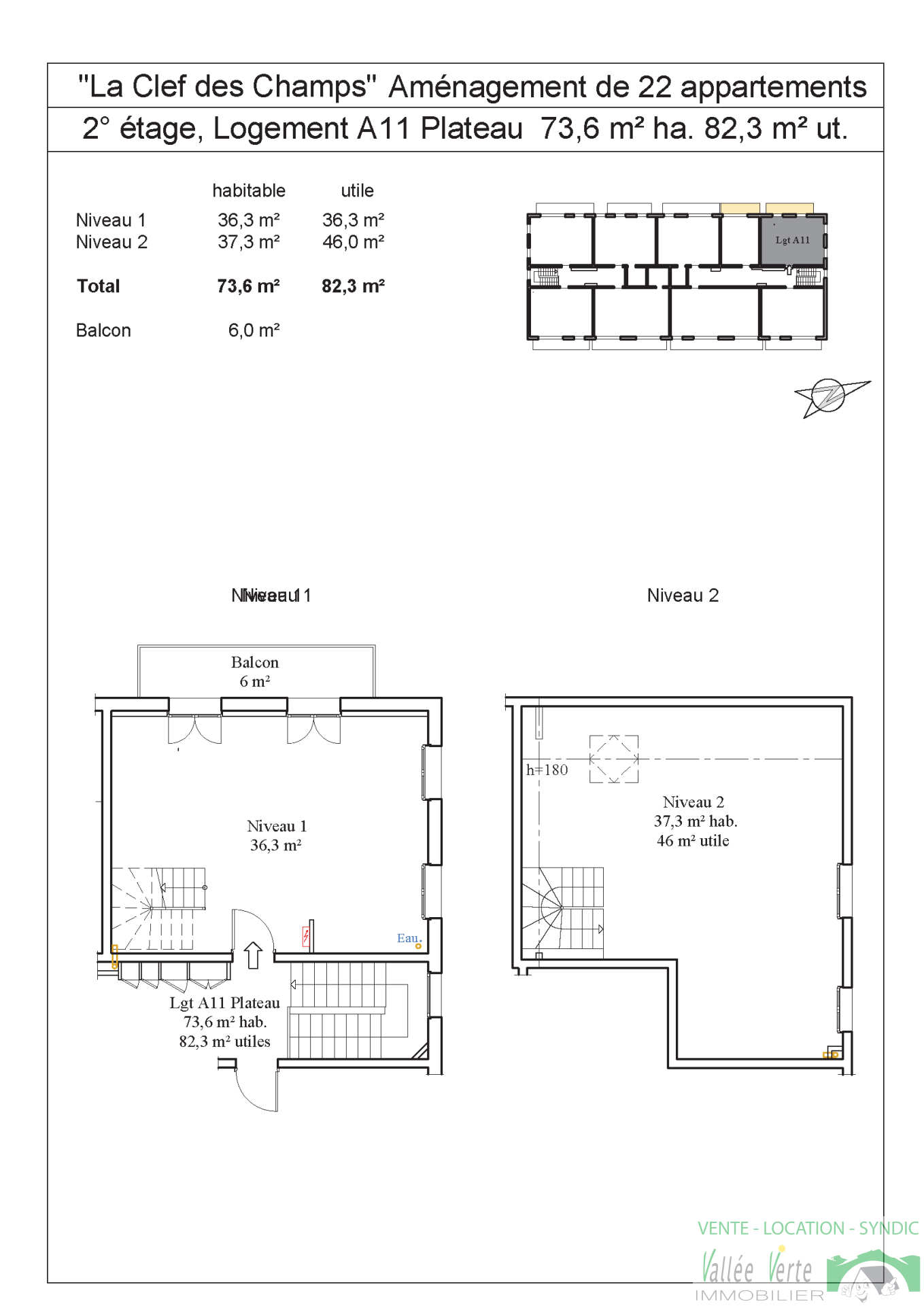 Dans un ensemble immobilier de 22 logements/plateaux sur les hauteurs de Saint-Jeoire, Plateau type T3 au 2ème étage d'une surface de 73.60 m2 + Balcon de 6 m2 et une place de parking.
