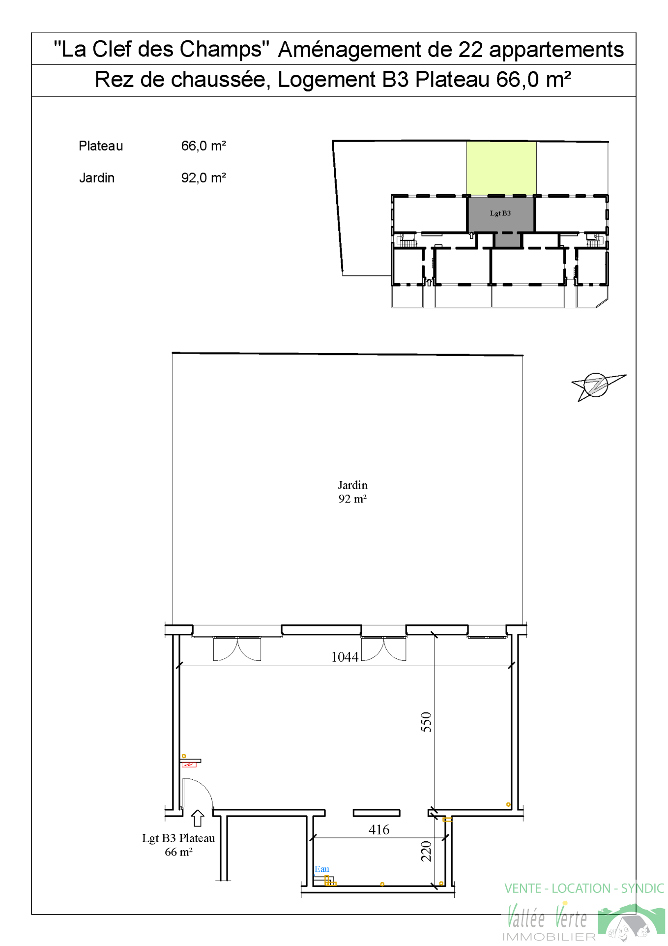 Dans un ensemble immobilier de 22 logements/plateaux sur les hauteurs de Saint-Jeoire, Plateau type T3 au rez de chaussée d'une surface de 66 m2 + Jardin de 92 m2 et une place de parking.