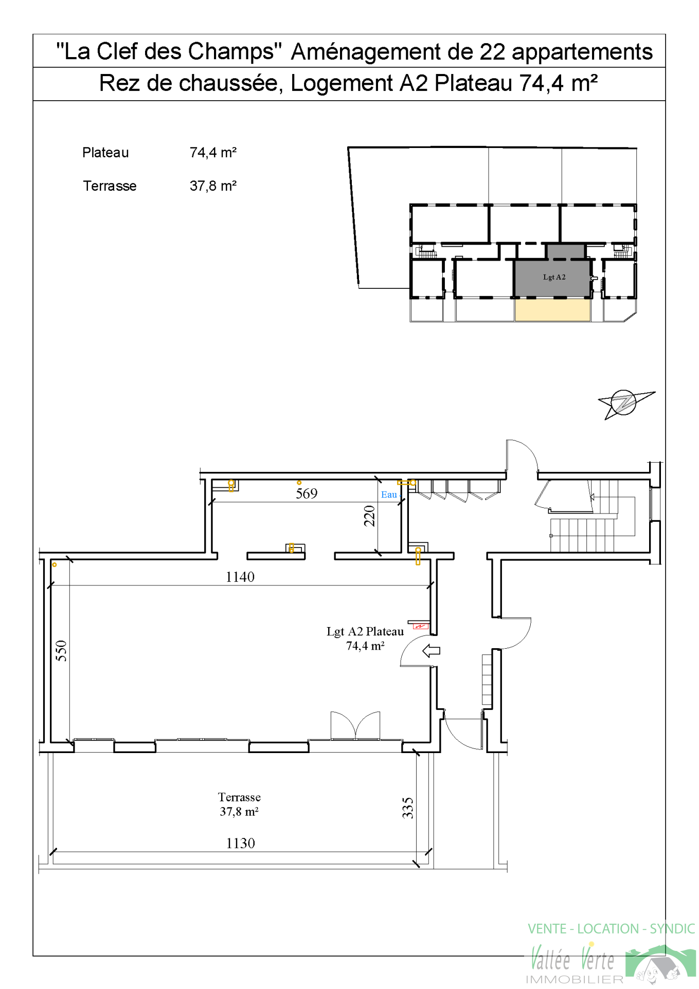 Dans un ensemble immobilier de 22 logements/plateaux sur les hauteurs de Saint-Jeoire, Plateau type T3 au rez de chaussée d'une surface de 74.40 m2 + terrasse de 37.80 m2 et une place de parking.