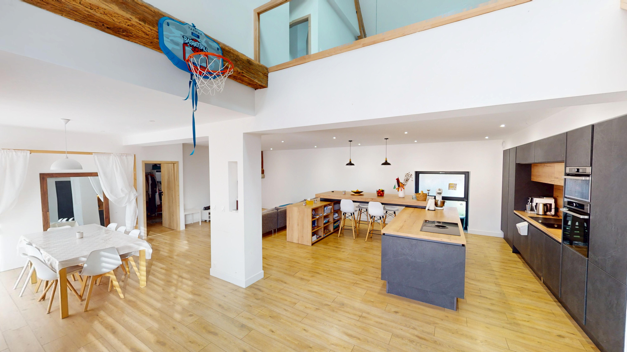 Au rez-de-chaussée : une entrée, un WC, un vaste salon/séjour ouvert sur une cuisine aménagée et équipée,...