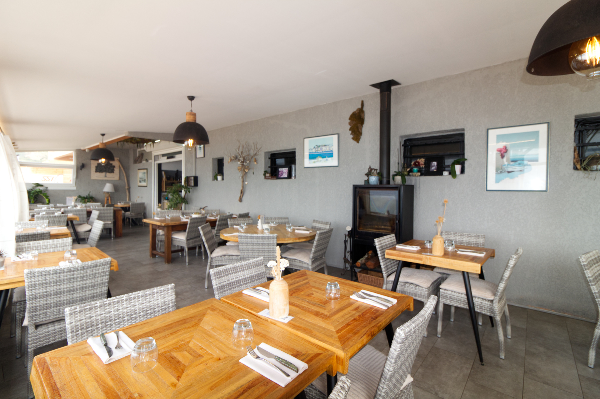 Vue mer panoramique exceptionnelle pour ce restaurant pied dans l'eau très joliment décoré.
