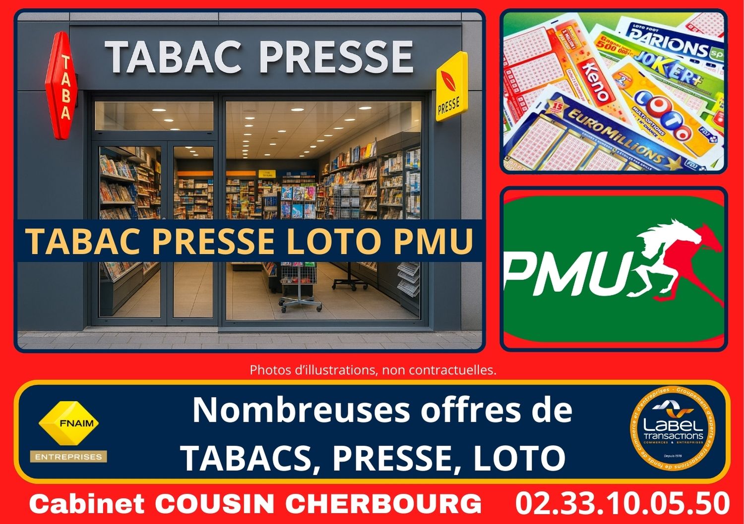 A VENDRE, DEPT 50, BAR-TABAC-PRESSE-LOTO-JEUX-PMU : Affaire pour couple. Très belle affaire rénovée. Grand appartement 3 chambres, 1 pièce de vie. Grand jardin privatif. Commissions : 138 000 euros. CA : 129 000 euros. EBE : 134 000 euros. Vente murs et fon...