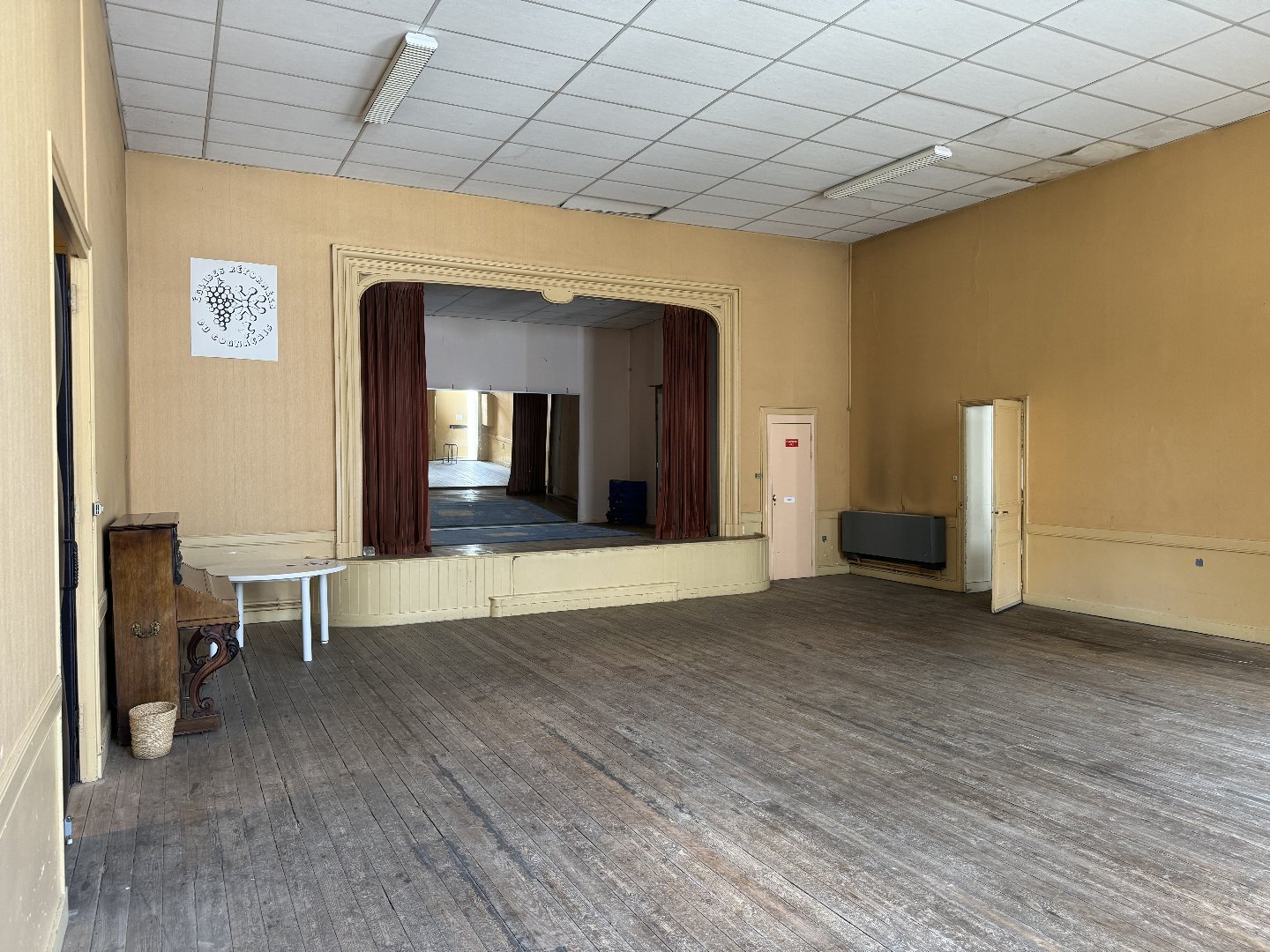 Ensemble immobilier à renover situé à deux pas des commerces, comprenant : entrée, une grande pièce d'environ 87m² avec une scène, une cuisine, une pièce bureau d'environ .50m², local chaufferie, wc. Petite cour. TAE.