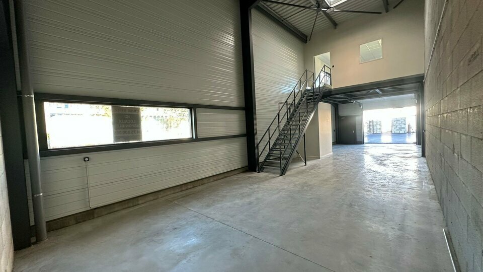 BATIMENT structure Eiffel/moellon revêtement à la chaux, 1 051 m² sur deux étages, deux portes sectionnelles, monte charge accompagner, grand vitrage, préau commun, entrée/sortie du tènement.Possibilité de clés en main.Place de parking, terrain clos,