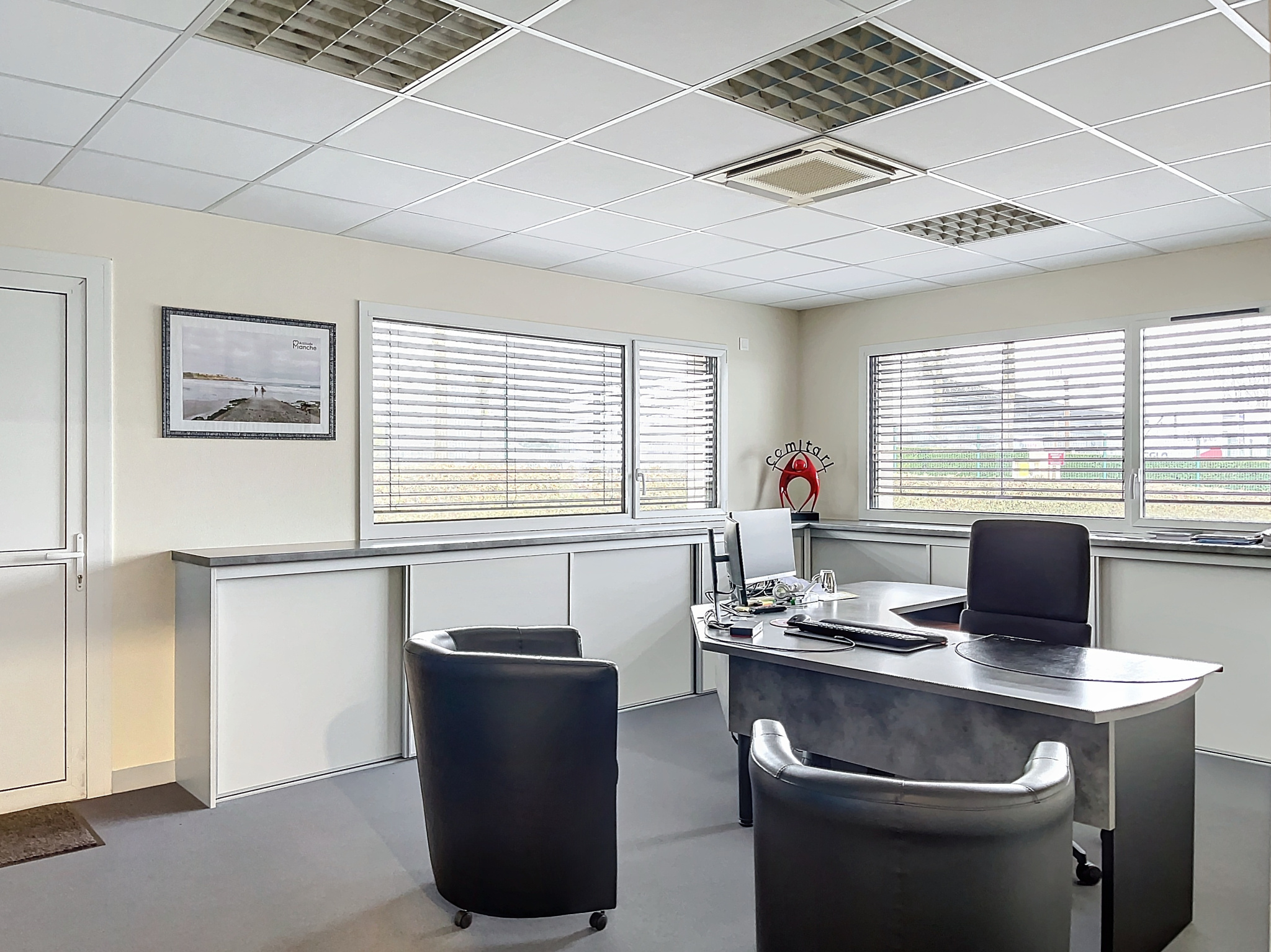 Sur la partie avant, un grand espace d?accueil avec une salle d?attente, 4 bureaux, u...
