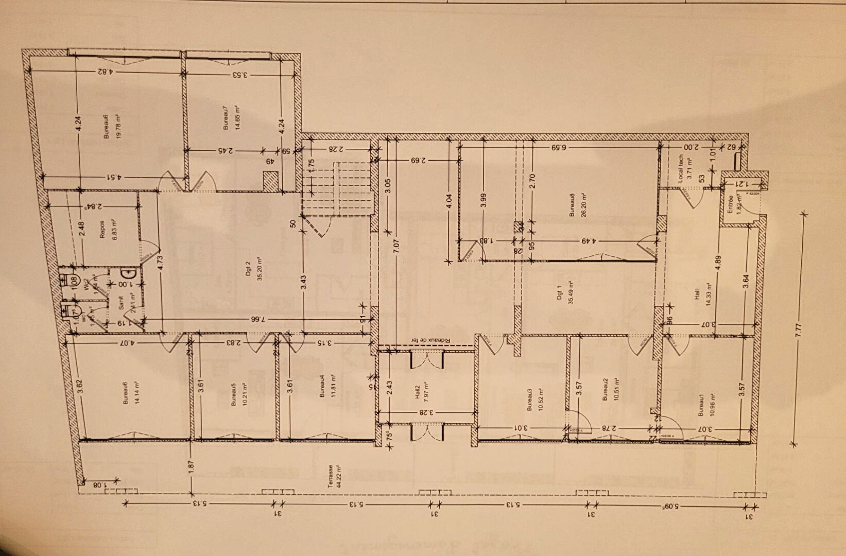 Beaux bureaux en rez-de-chaussée dans un hôtel particulier rénové du centre-ville à proximité du parking du Plateau actuellement loué avec un bail professionnel. La surface totale est de 114 m² et elle comprend une salle d'attente, 4 bureaux, une cuisine,...