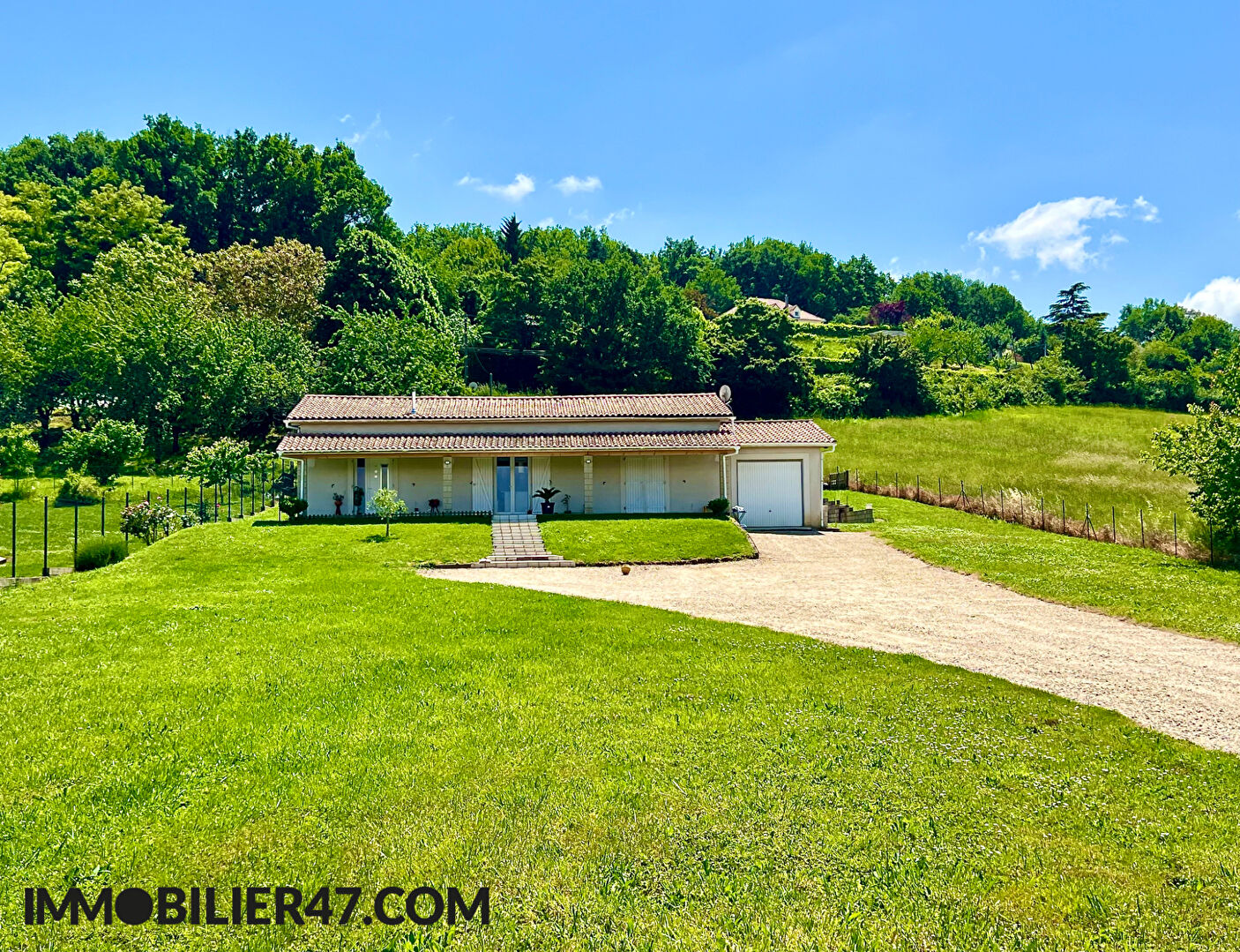 Sur la commune d'Aiguillon (47190), en campagne, villa de plain pied de construction traditionnelle et en parfait état, composée de trois chambres, vaste pièce à vivre d'environ 50m2, avec cuisine équipée et poêle à granules. Le tout sur environ 4200...