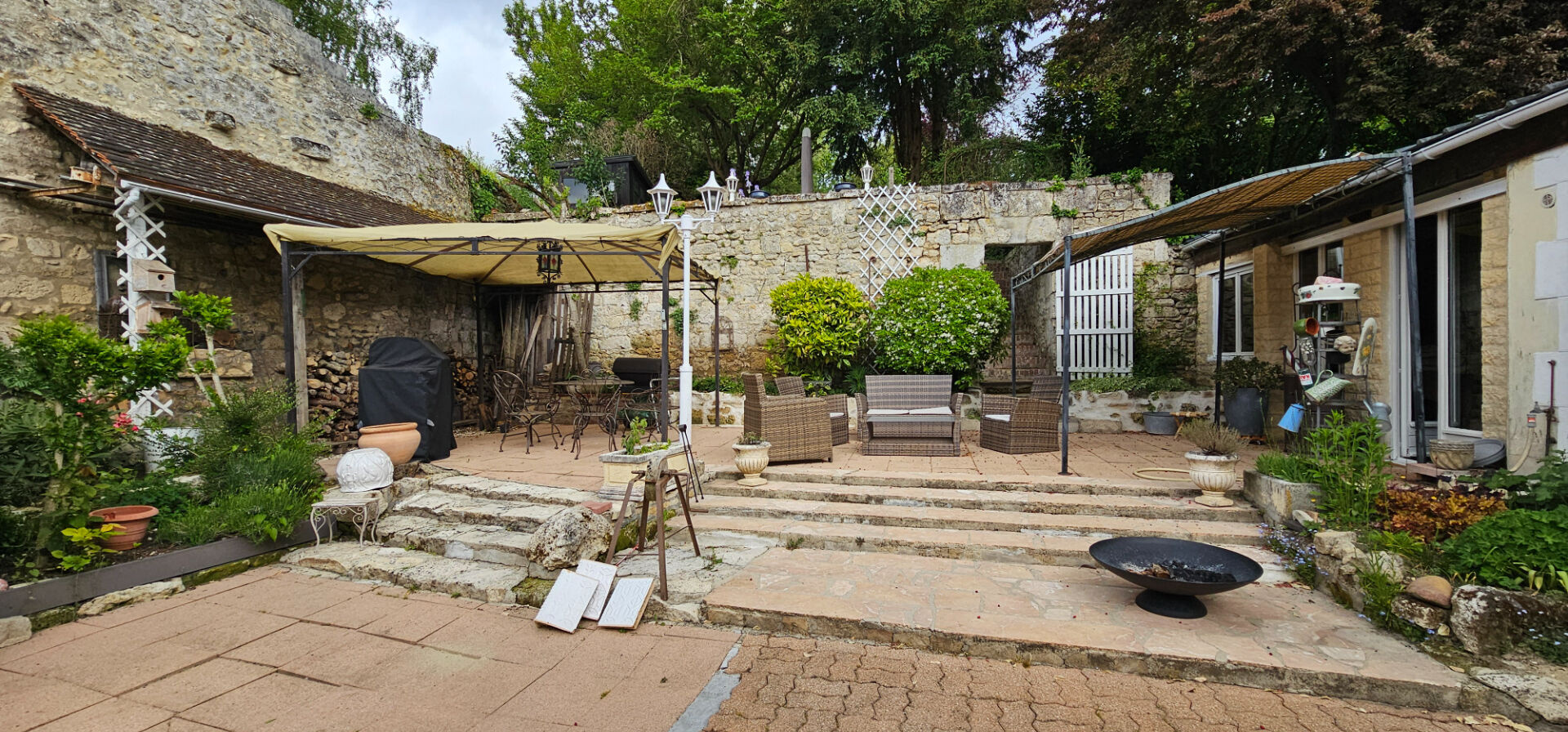 Charme et Confort : Maison en retrait de rue avec cour avant, salon-séjour avec cheminée, cuisine équipée donnant sur un jardin clos de murs.