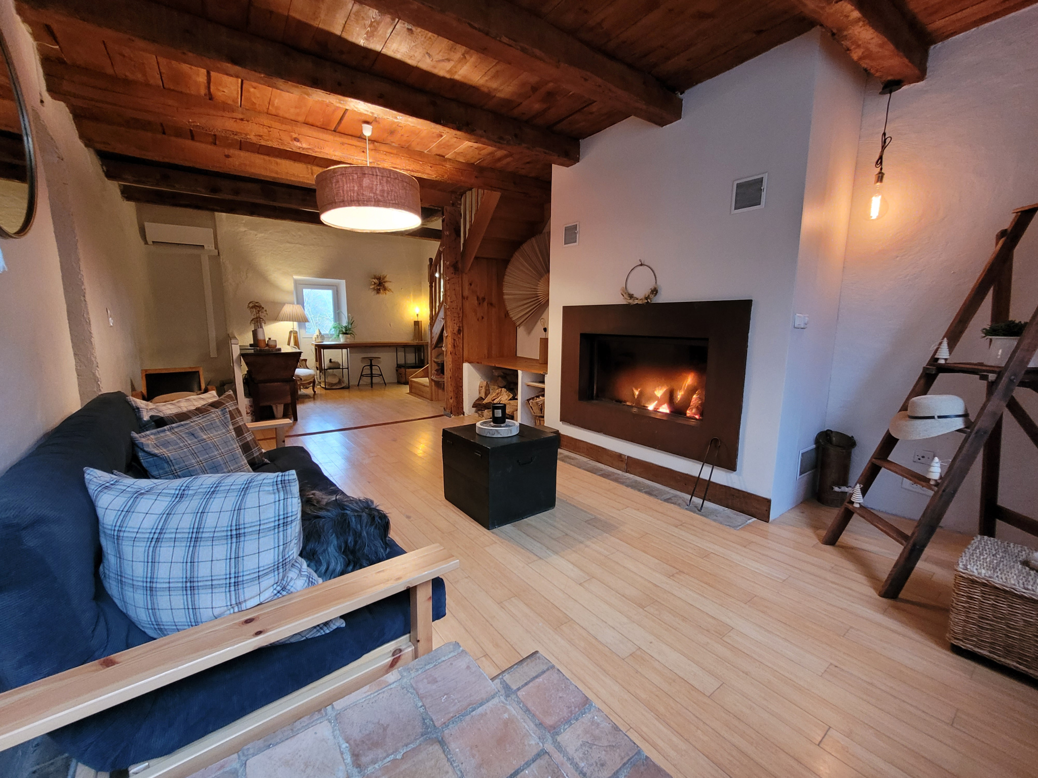 Rdc : un séjour avec cheminée, une cuisine, une chambre, une salle de bain/wc