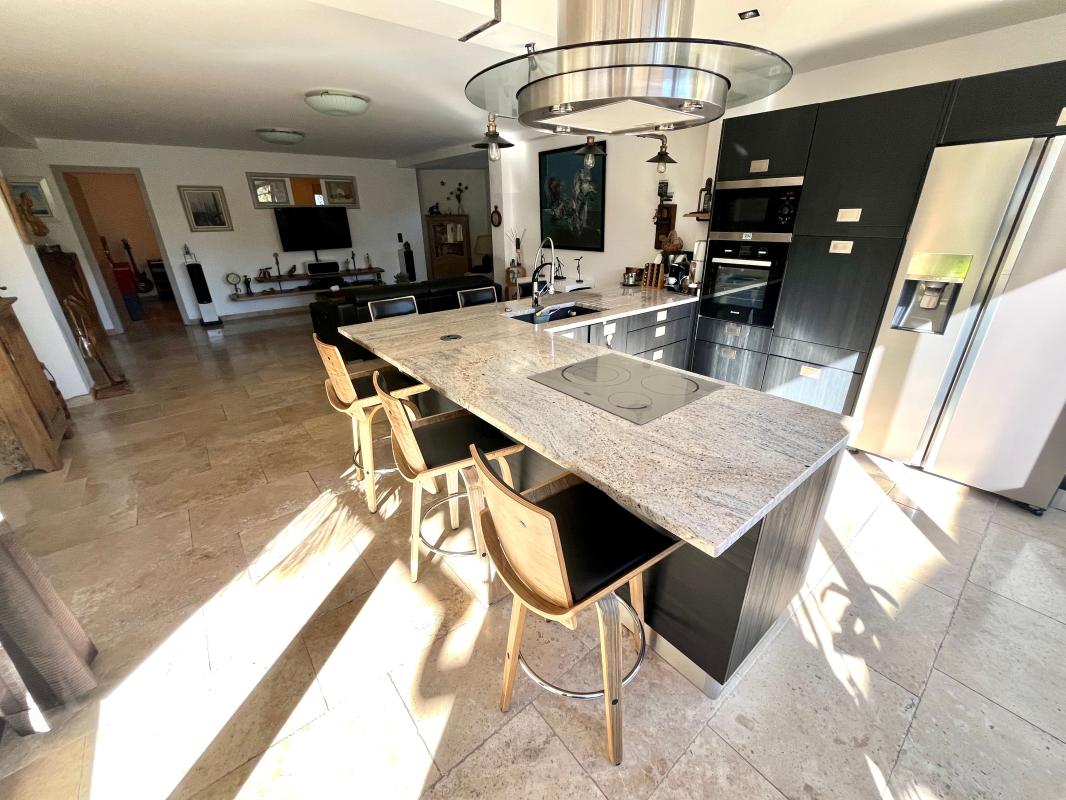 Le rez-de-chaussée surélevé comprend un séjour, une salle à manger, une grande cuisine avec bel espace repas, un office, cellier, buanderie et toilette.