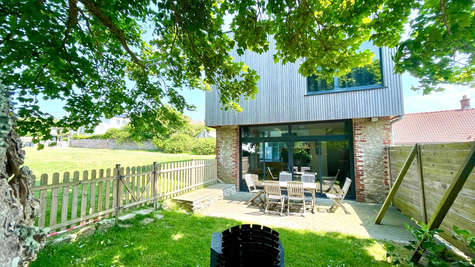 Ambleteuse, 10 mn de la plage, Superbe Villa Contemporaine récente en excellent état avec jardin plein sud, grande terrasse et pergola (50m2), parking 3 voitures + carport, 2 garages et comprenant : une grande entrée sur vaste séjour avec cuisine équipée ouver...