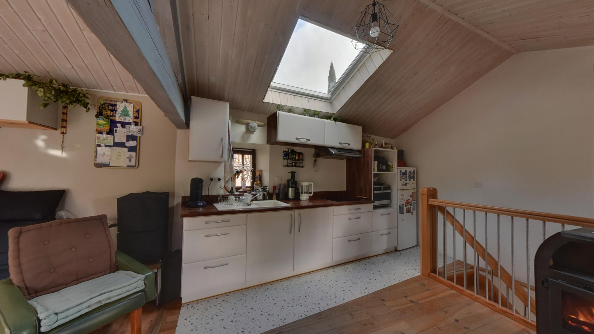 Elle se compose au 1er étage, d'une entrée desservant une cuisine avec un accès direct à une immense terrasse, une salle d...