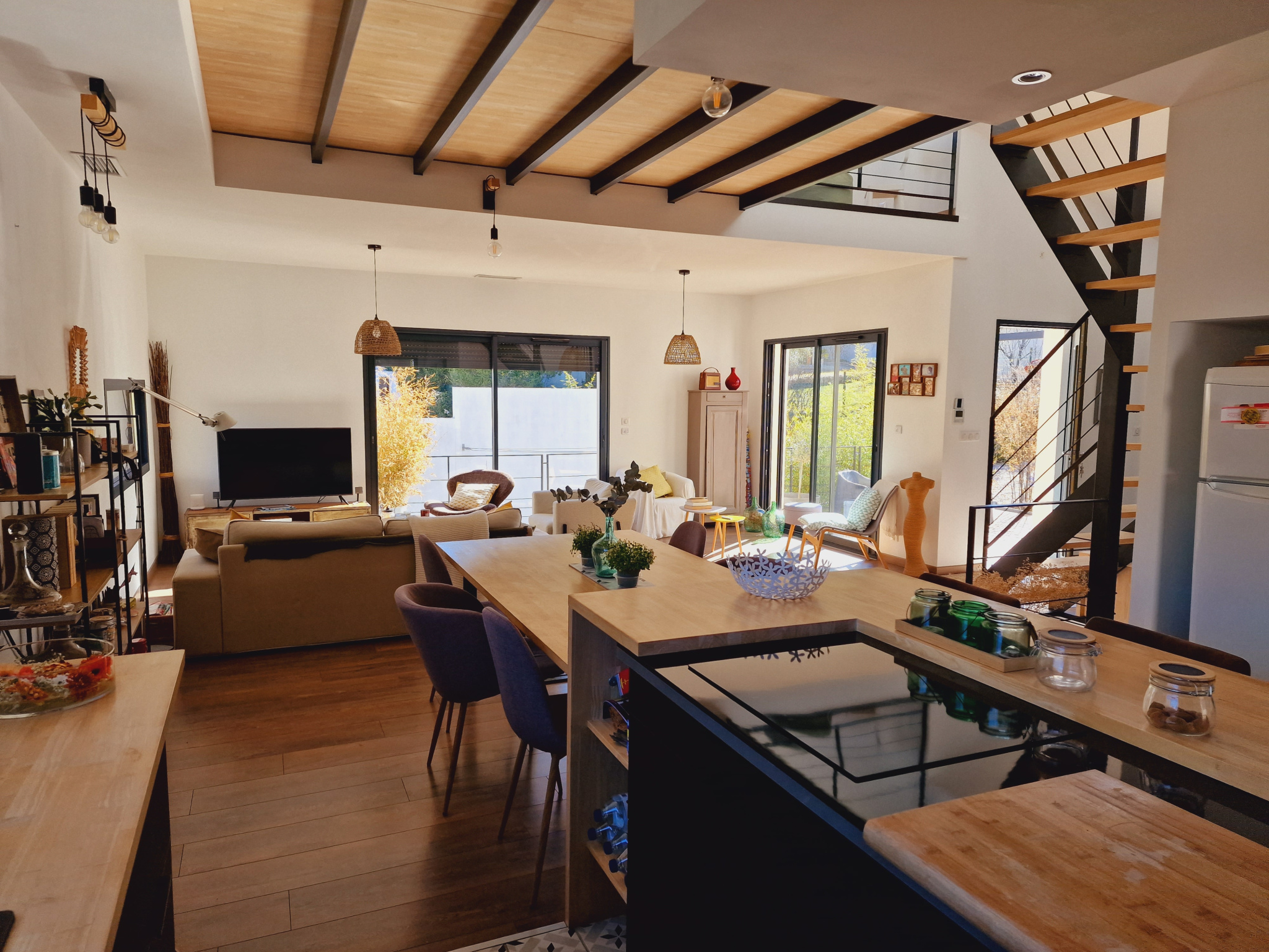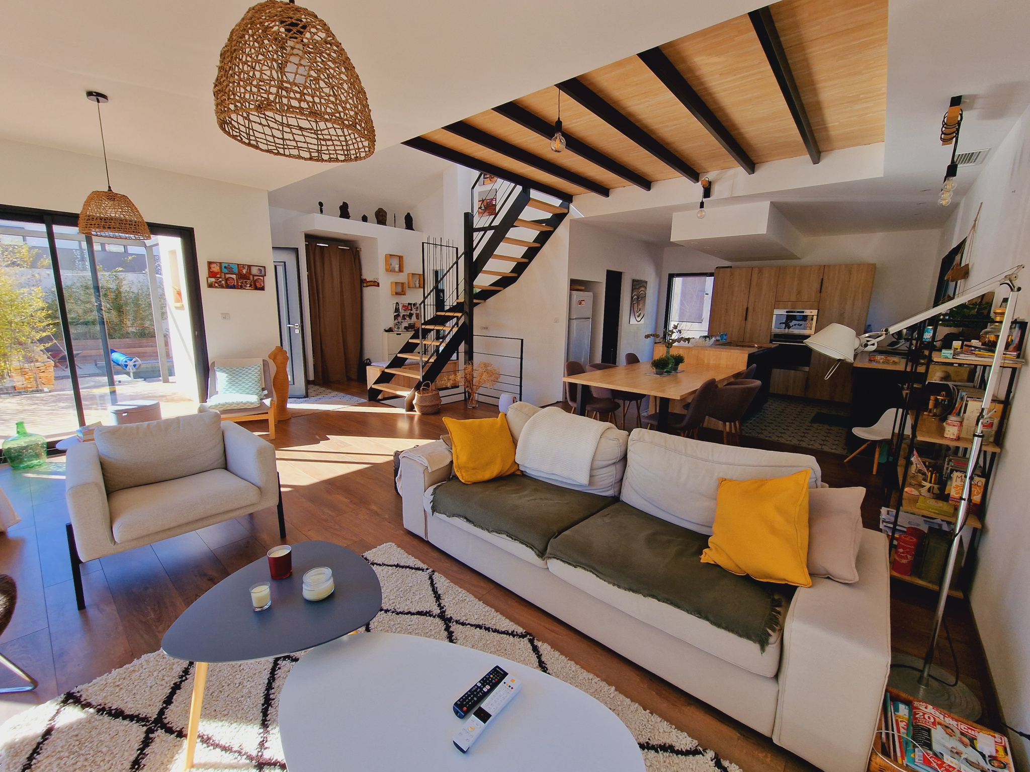 belle pièce de vie qui donne sur la terrasse et piscine