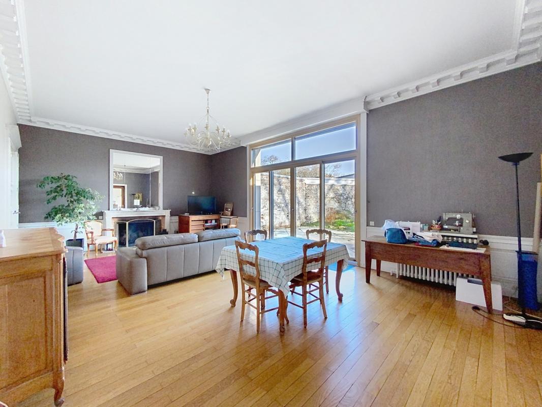 En hyper centre ville, à proximité de la gare, magnifique maison bourgeoise double distribution avec extérieur cosy sans vis-à-vis, cave et garage 3 voitures. Elle propose au rez-de-chaussée un vaste salon/séjour avec parquet chevron, une salle à manger, une c...