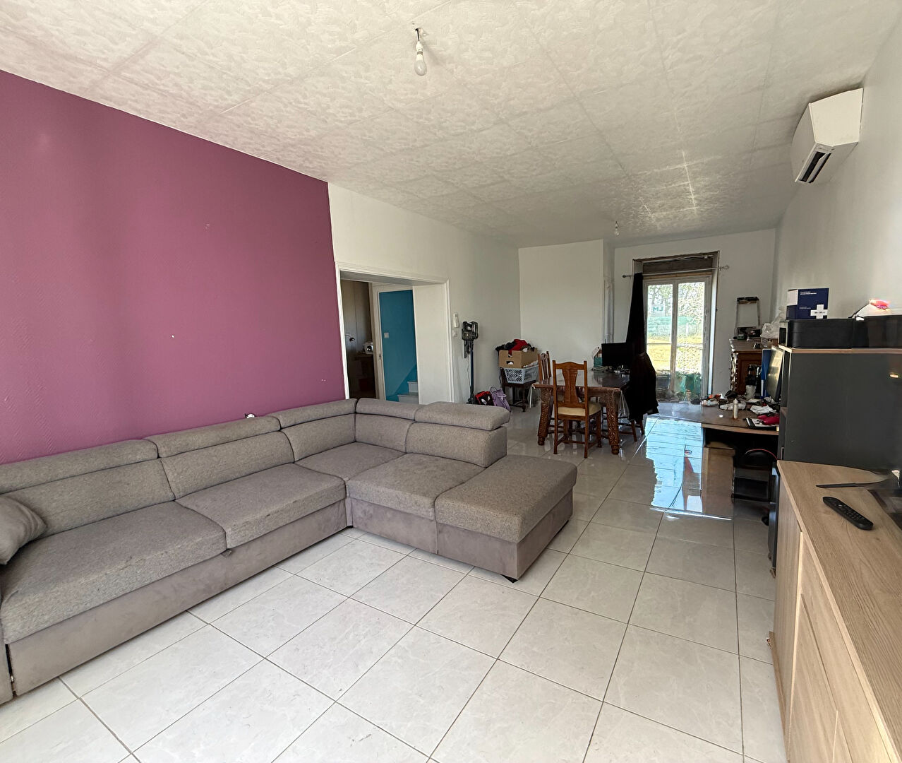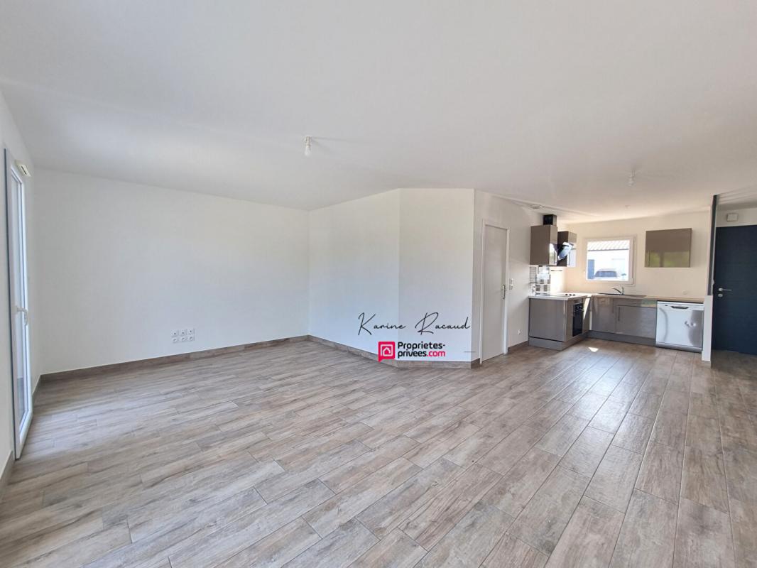 Cette maison est composée d'une entrée avec placard, d'un salon-séjour de 33m2 et d'une cuisine ouverte aménagée et équipée.