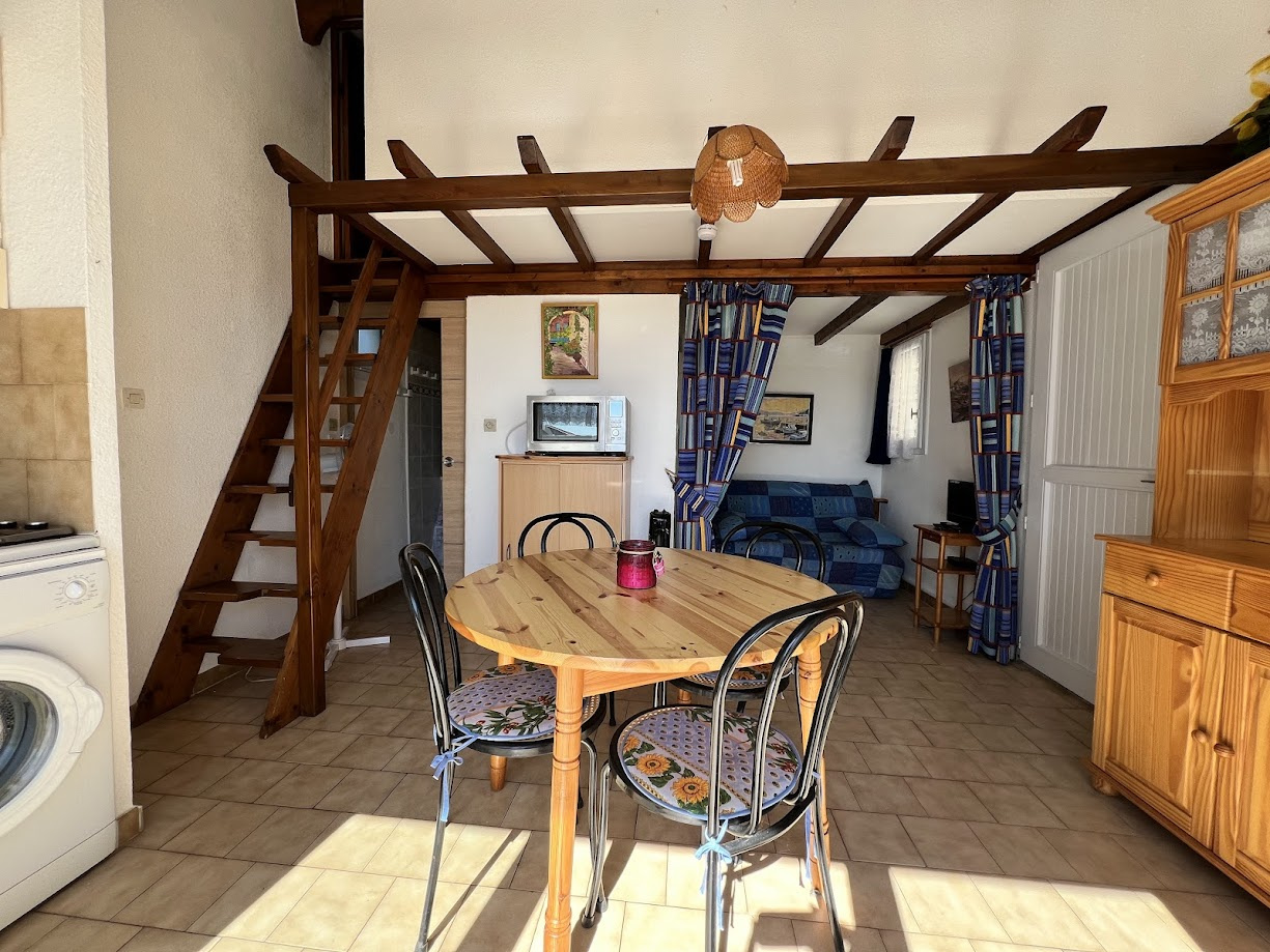 Pièce à vivre avec cuisine équipée en accès direct sur la terrasse. Chambre en mezzanine avec espace de couchages supplémentaires. De belles prestations. Par...