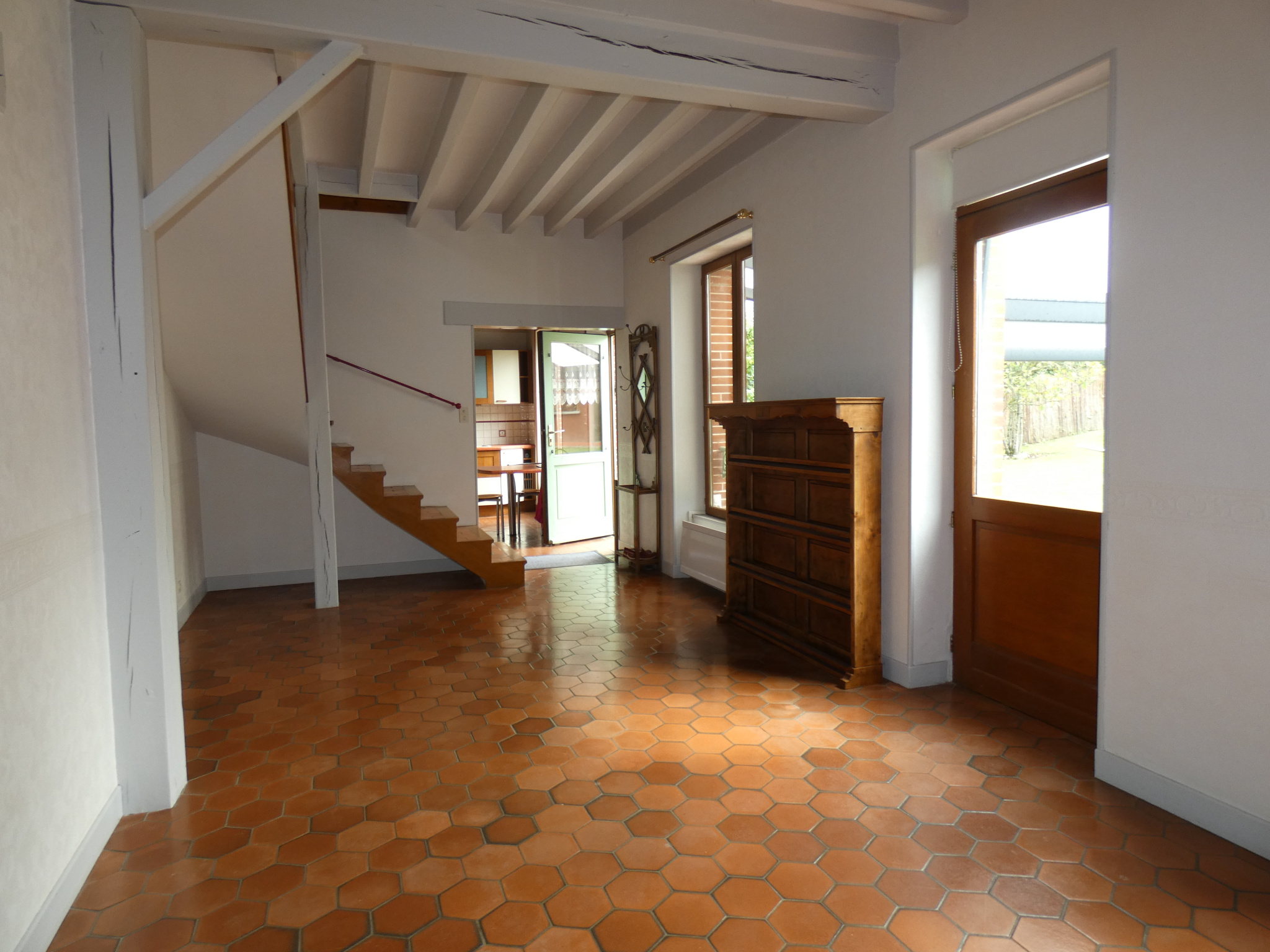 Au rez-de-chaussée, la maison offre une entrée sur cuisine, un séjour lumineux, une salle de bains avec WC, ainsi qu'une pièce supplémentaire attenante au séjour, idéale pour un bureau ou une chambre d'appoint.