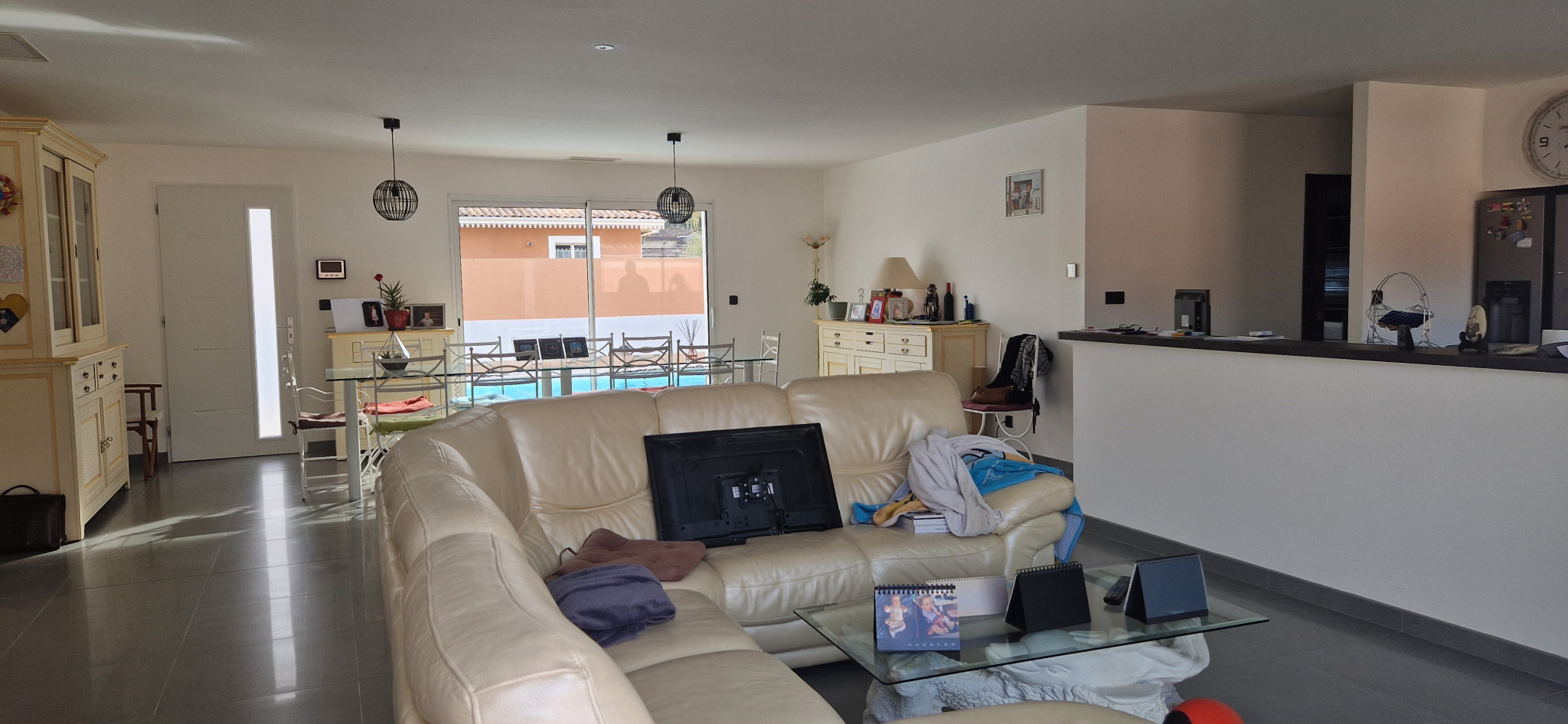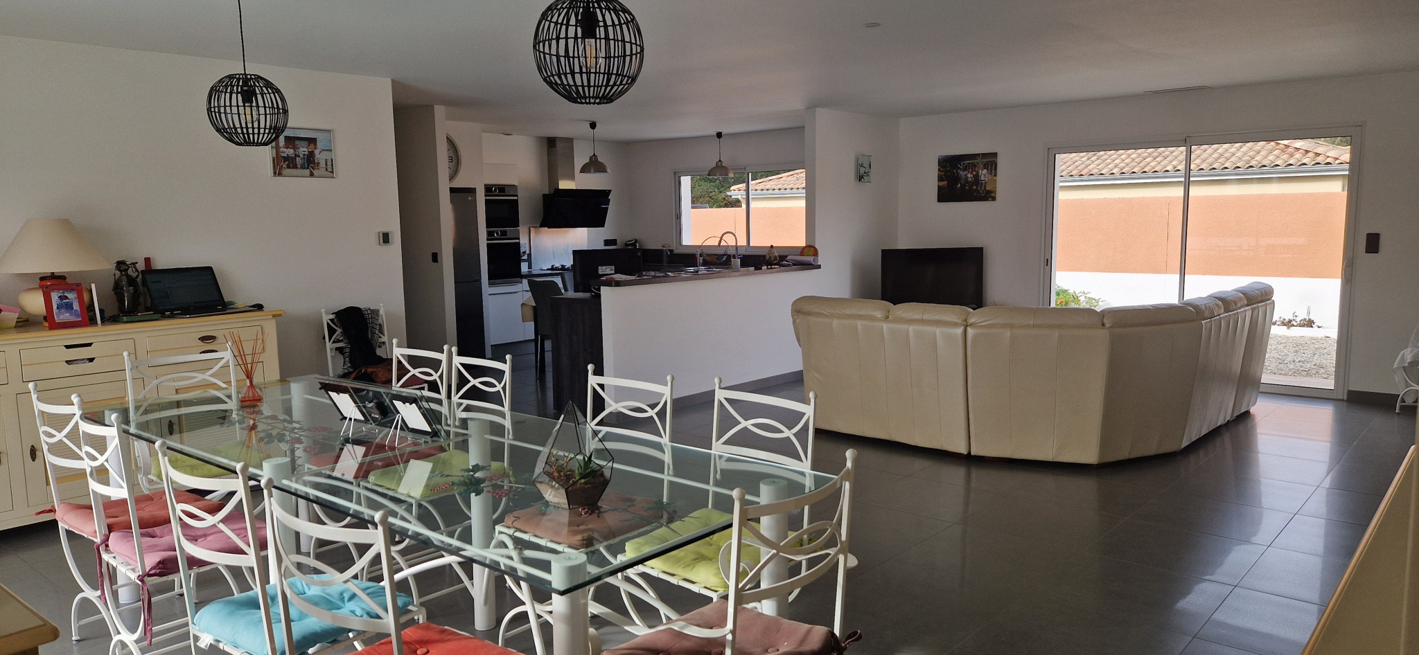 belle maison de plain-pied 145 m2 comprenant, un séjour avec cuisine équipée, cellier, dégagement, trois chambres avec placards, salle de bains avec baignoire et douche à l'italienne, WC, terrasse couverte carrelée avec BBQ...