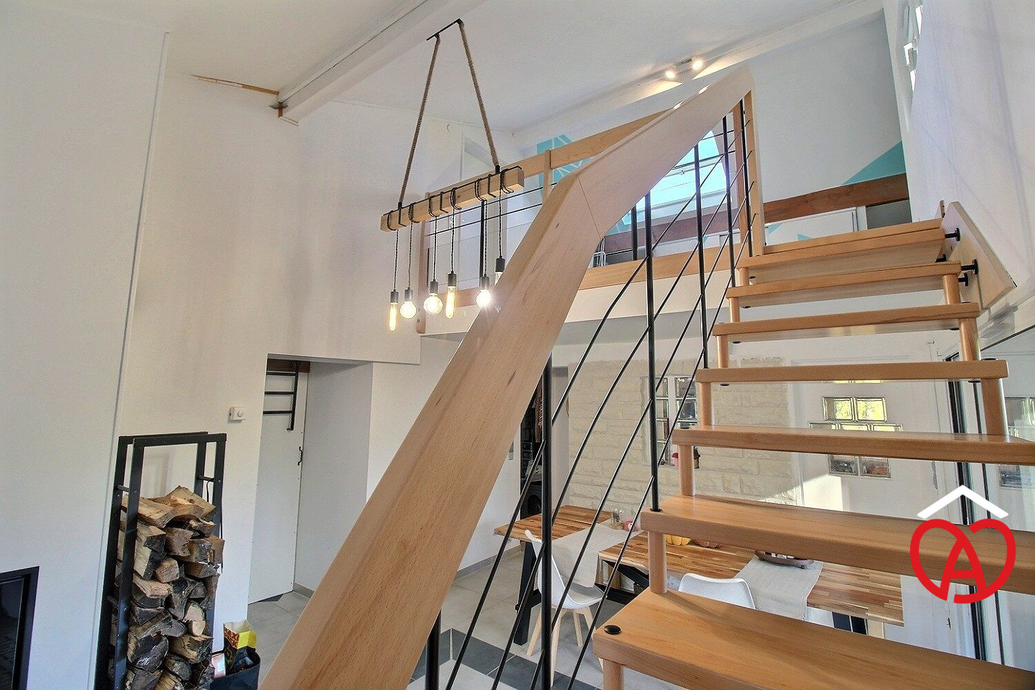 En rdc : Entrée, salon-séjour lumineux avec poêle à pellet et clim réversible, cuisine équipée ...