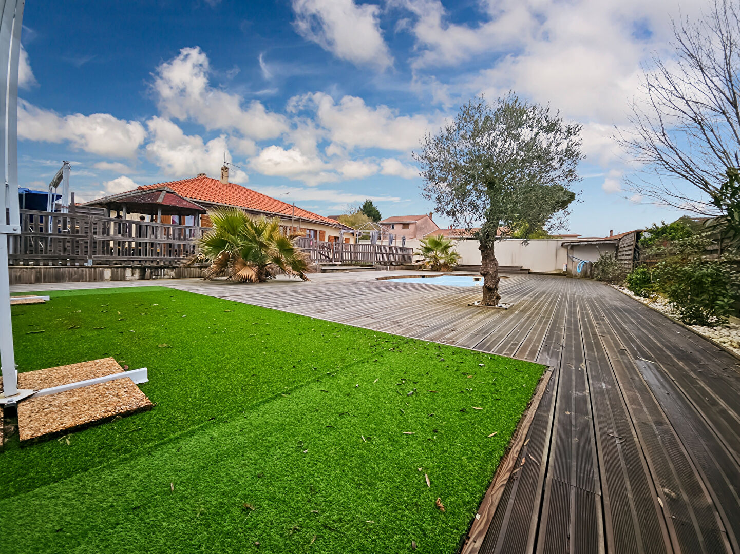 Maison de plain pied comprenant: entrée, cuisine ouverte avec ilot central sur un double sejour , salle d'eau, wc, 3 chambres, garage et parkings , piscine, sur un terrain de 765 m2 environ.