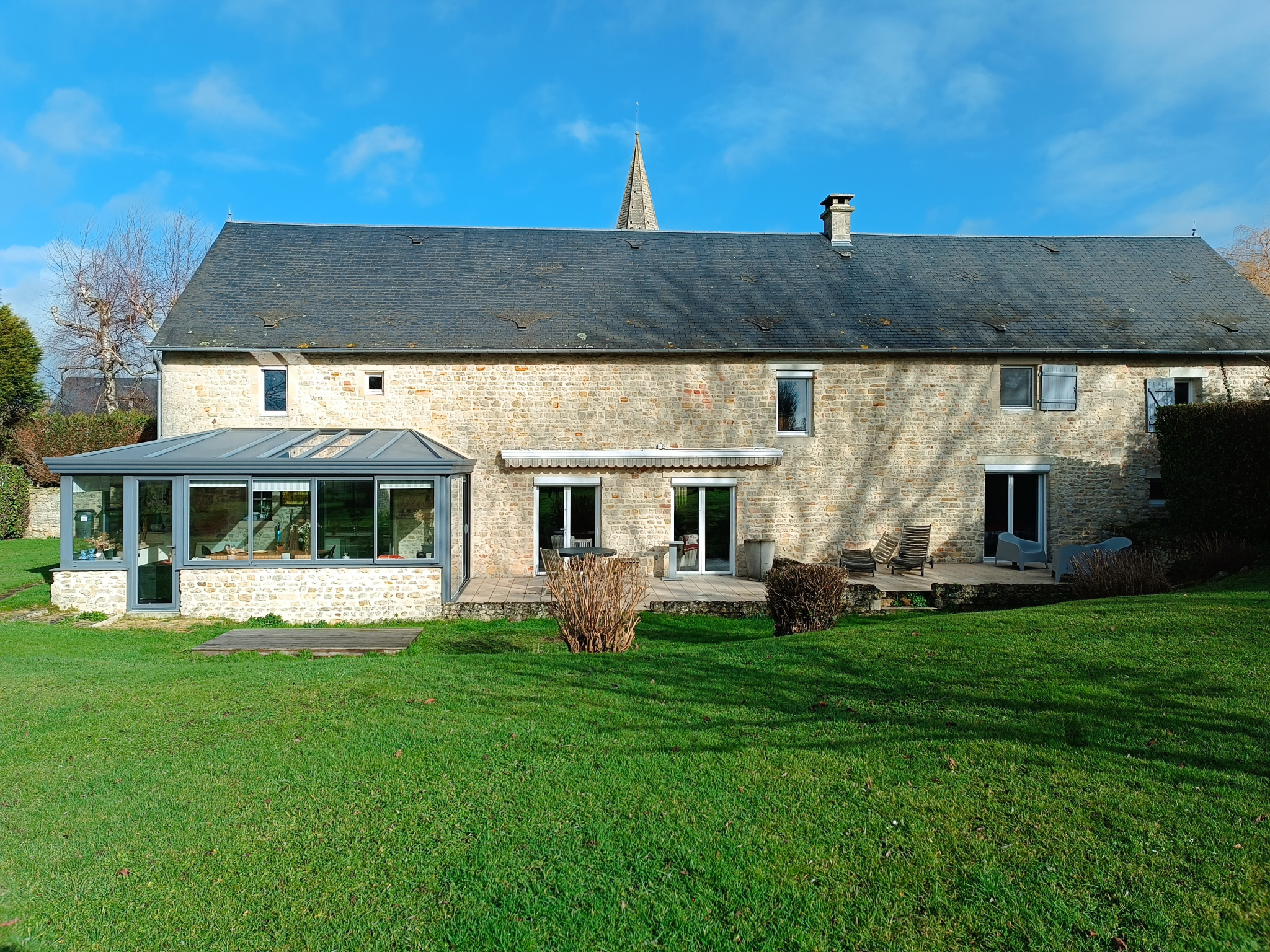 MAISONS ANCIENNES vous présente à 10 minutes de Bayeux en direction de Caen, une superbe maison en pierre de 192 m2 habitables avec de grands volumes, un gîte pour 4 personnes, plusieurs dépendances et un immense jardin arboré avec vue sur la campagne.