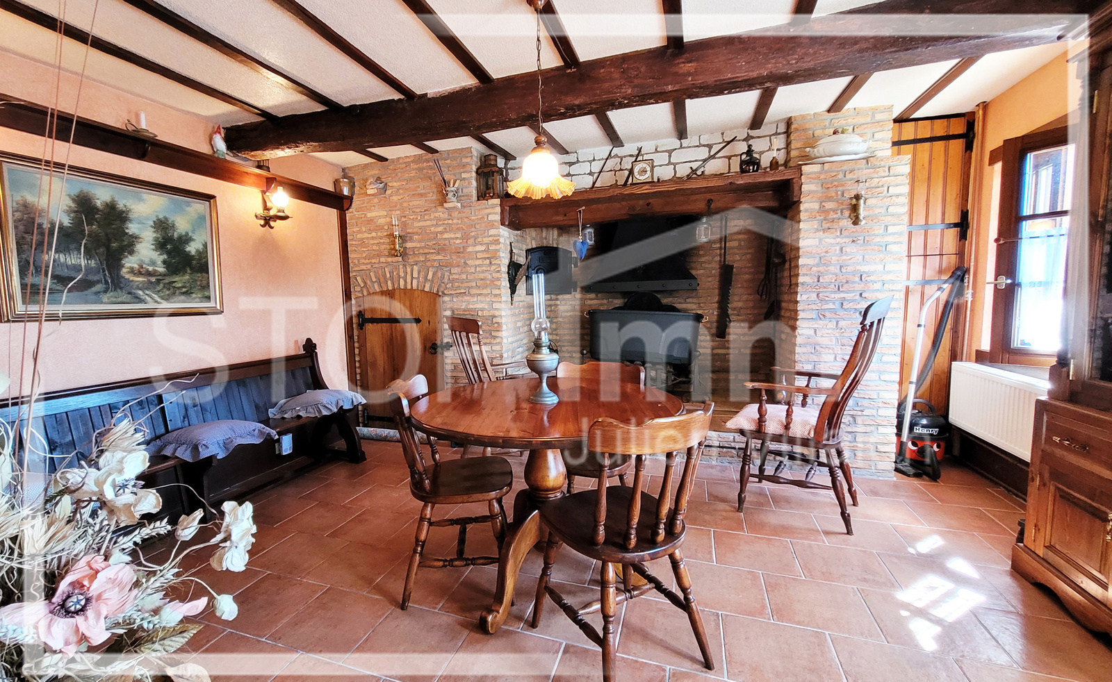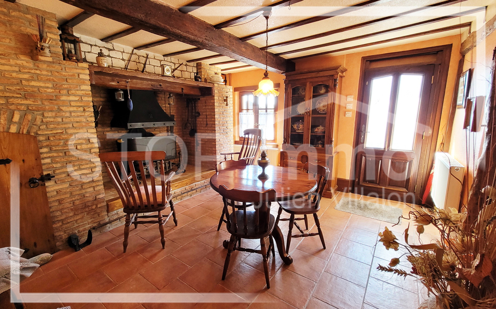 Un hall d'entrée menant à une salle à manger avec une cheminée et un four à pain,