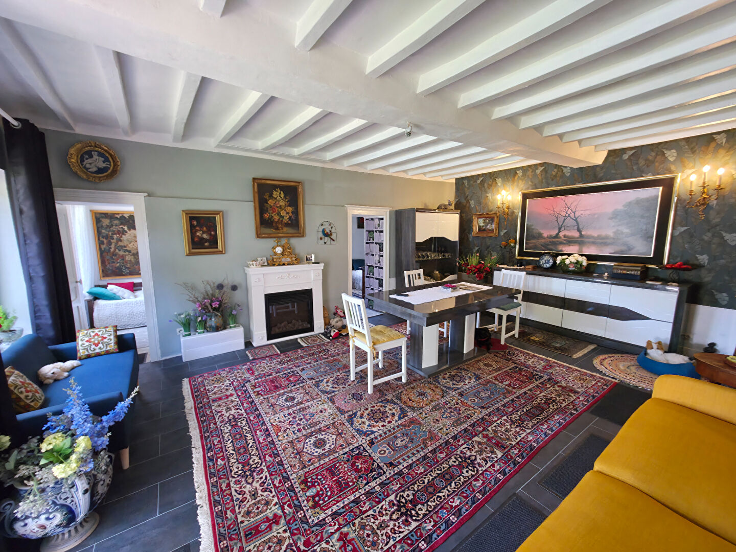 Le rez-de-chaussée comprend un double séjour avec cheminée à foyer ouvert, prolongé par...