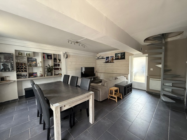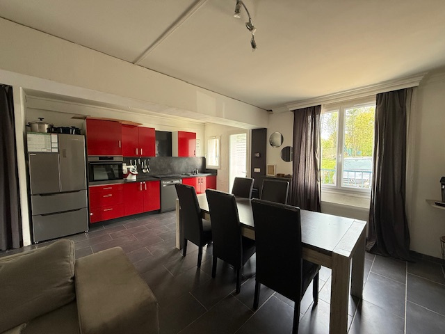 Au rez-de-chaussée : séjour / salle à manger ouvert sur cuisine aménagée et équipée.