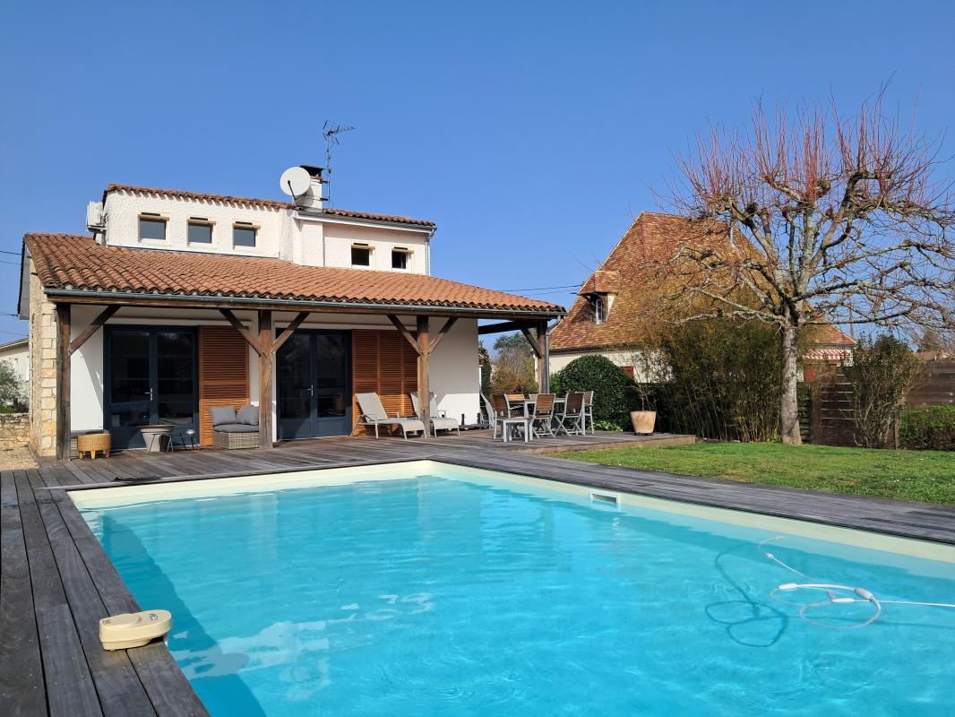 À seulement 15 minutes à l'Est de Bergerac, cette maison de caractère entièrement rénovée entre 2019 et 2023 d'environ 125m2 sur un terrain de 1000m2 clos et arboré avec piscine, offre un cadre de vie paisible proche de la Dordogne. Cette maison alli...