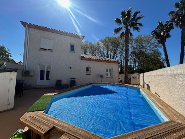 Très agréable maison de ville avec beau séjour salon de 48 m2 ouvrant sur terrasse et piscine hors sol, cuisine équipée, dressing, 3 chambres, grande salle de bains + douche, climatisation.