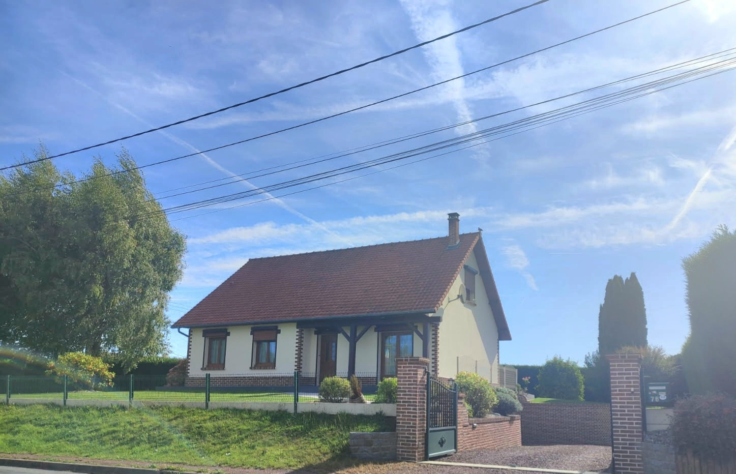 Secteur Bernaville pavillon individuel de bonne construction sur sous sol complet bati sur environ 1736 m2 de terrain offrant une autonomie de plain pied avec une entrée avec placards,un vaste séjour salon avec cheminée bois et poele à granules,une cuisine am...