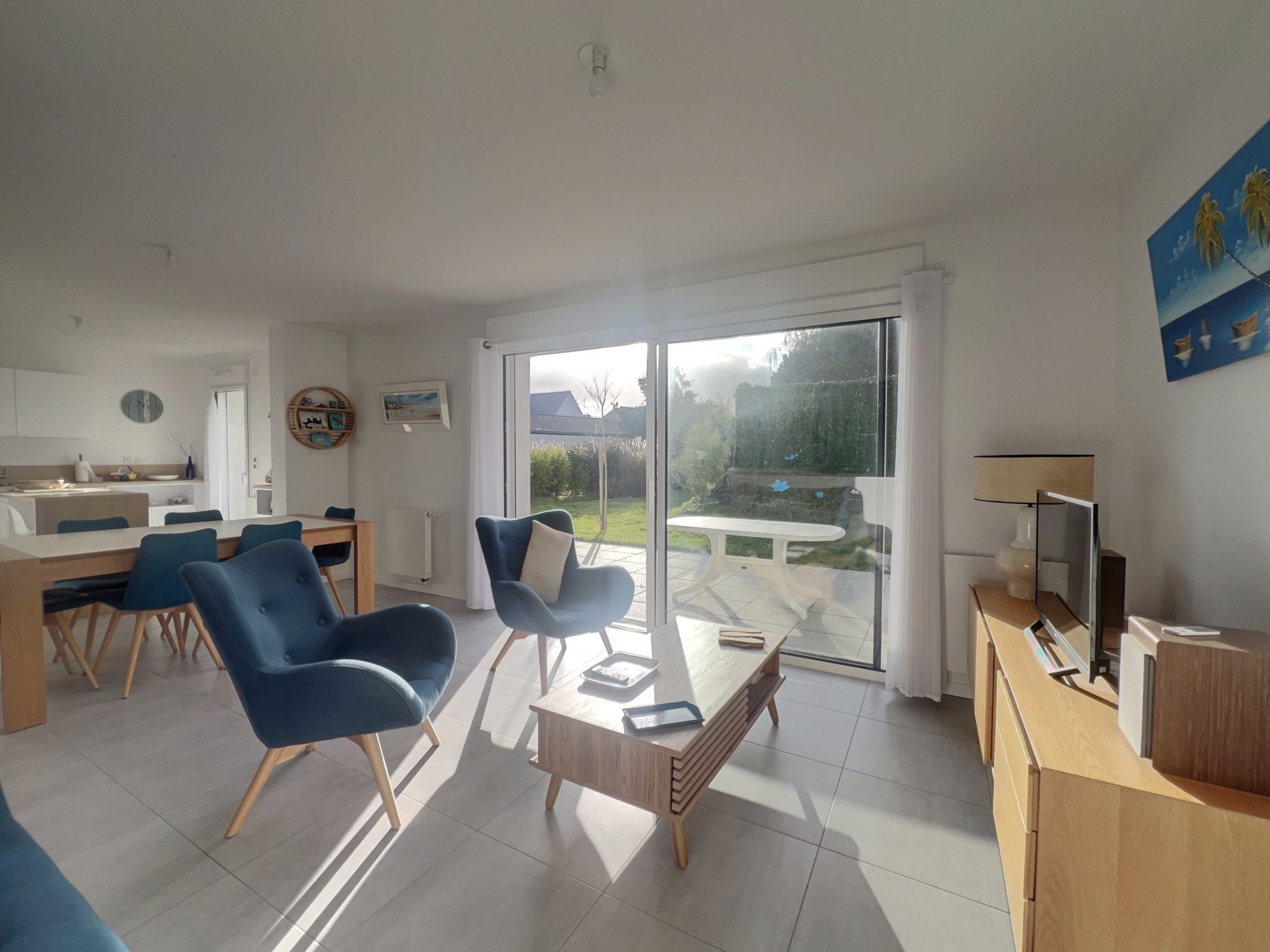 Carnac Maison de 2022 de 108 m2 habitables proche de la Grande Plage sur 2 niveaux composée au RDC d'une entrée donnant sur lumineux séjour avec salon et poèle hautes performances, espace repas, cuisine équipée ouverte, un bureau, salle d'eau et WC.<...