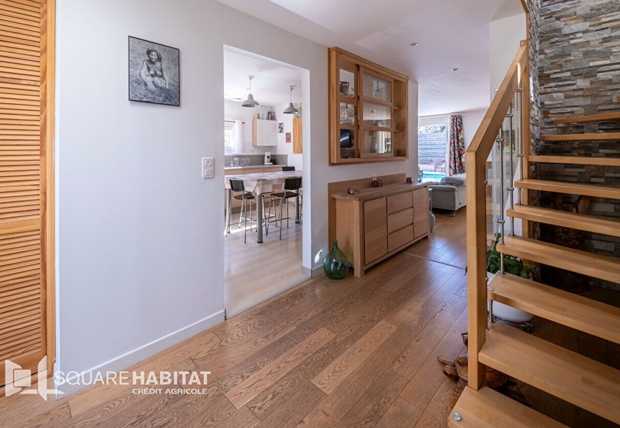 Bien pensée, cette maison fonctionnelle développe en RDC une vie de plain-pied : une entrée avec rangements (puit de lumière), une belle pièce de vie de 40 m² avec cheminée à inse...
