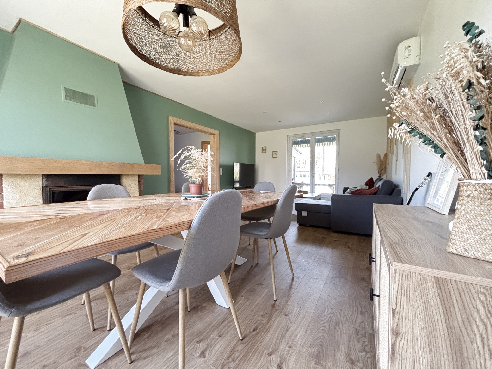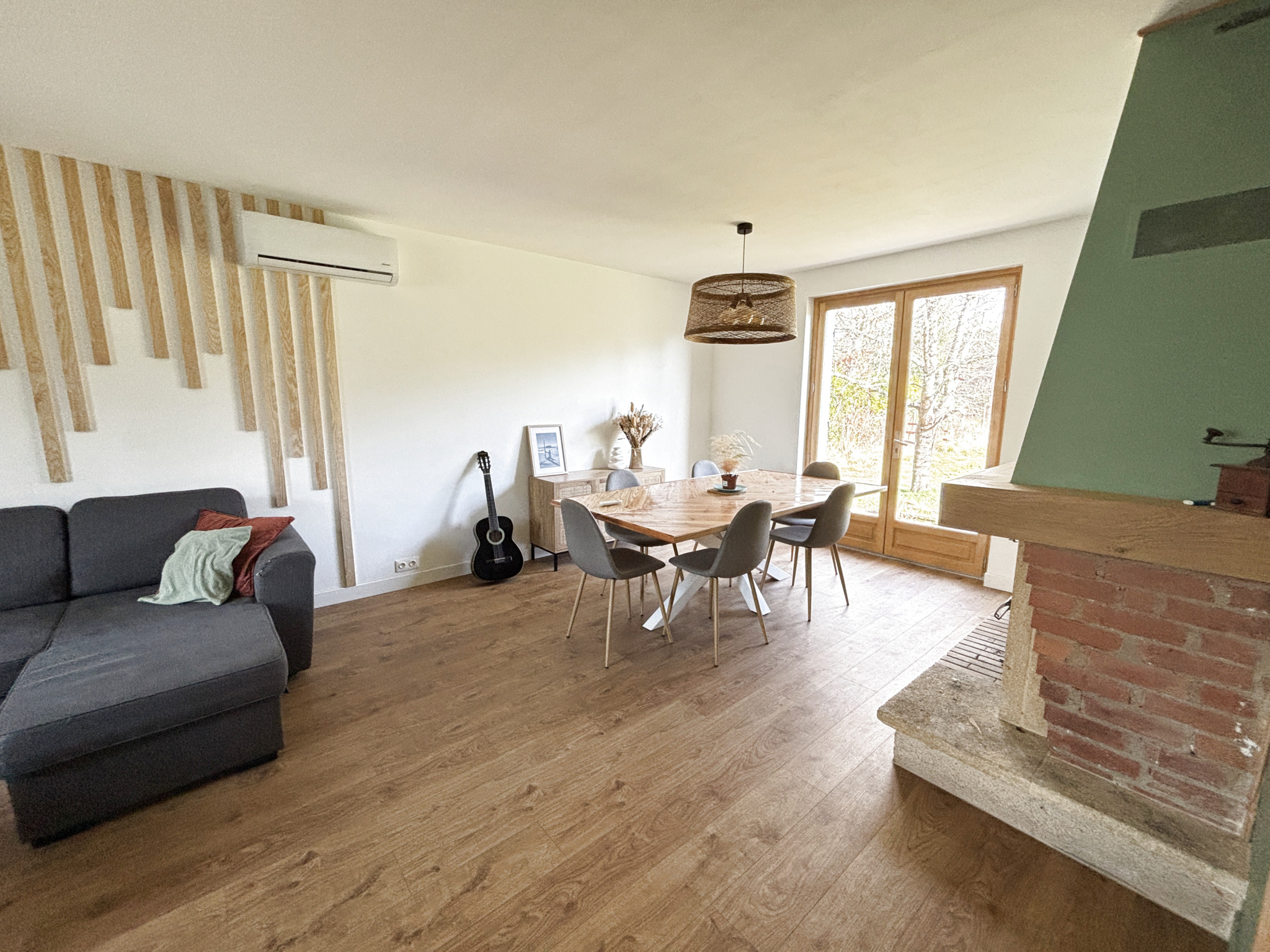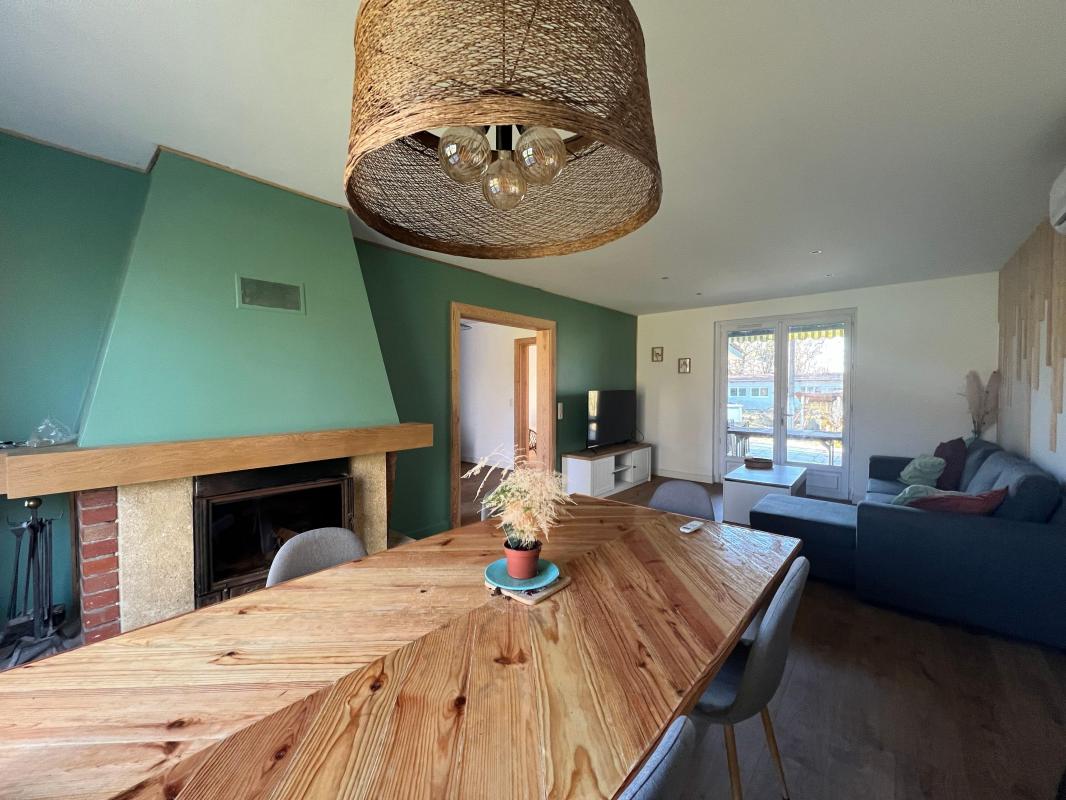 Composée au rez de chaussée d'un séjour lumineux avec cheminée et insert bois , salle à manger ,deux chambres dont une avec un dressing, une salle d'eau et un WC séparé.
