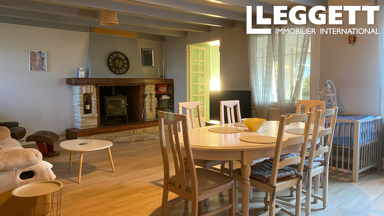 Au rez-de-chaussée, le salon de 28,21 m2 offre une atmosphère chaleureuse avec une cheminée en pierre et un poêle à gr...