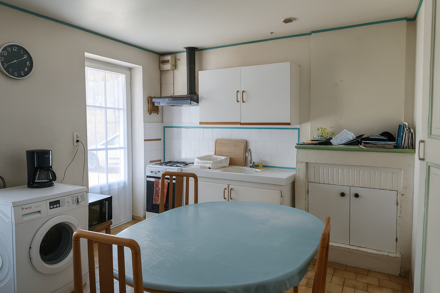 Cette maison rénovée située en centre bourg vous séduira par son authenticité , ses poutres apparentes et sa magnifique cheminée en pierres de taille :