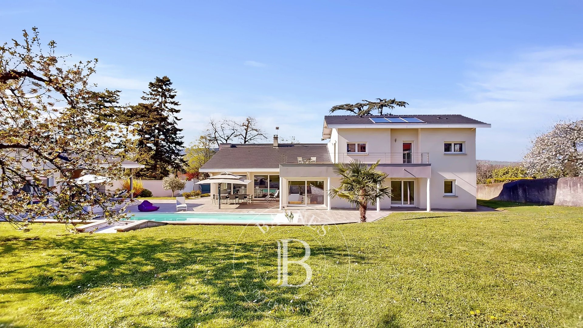 Située dans un secteur calme et résidentiel, à 5 minutes en voiture de l'autoroute Lyon-Saint Etienne, cette villa d'architecte construite en 2008, de 237 m² allie l'élégance d'une archi...