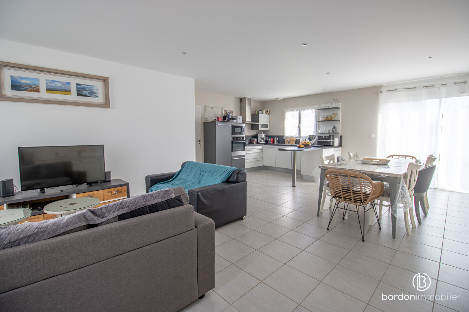 La pièce de vie lumineuse, sublimée par de grandes ouvertures f...