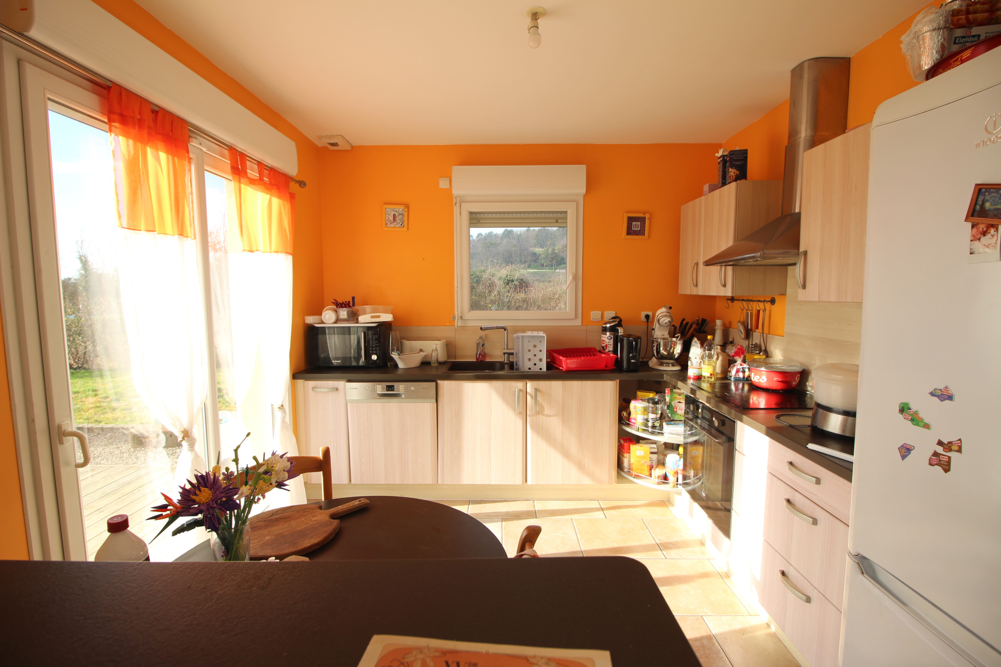 hall entrée, séjour/salle à manger avec poele à granulés, cuisine aménagée, équipée et ouverte,