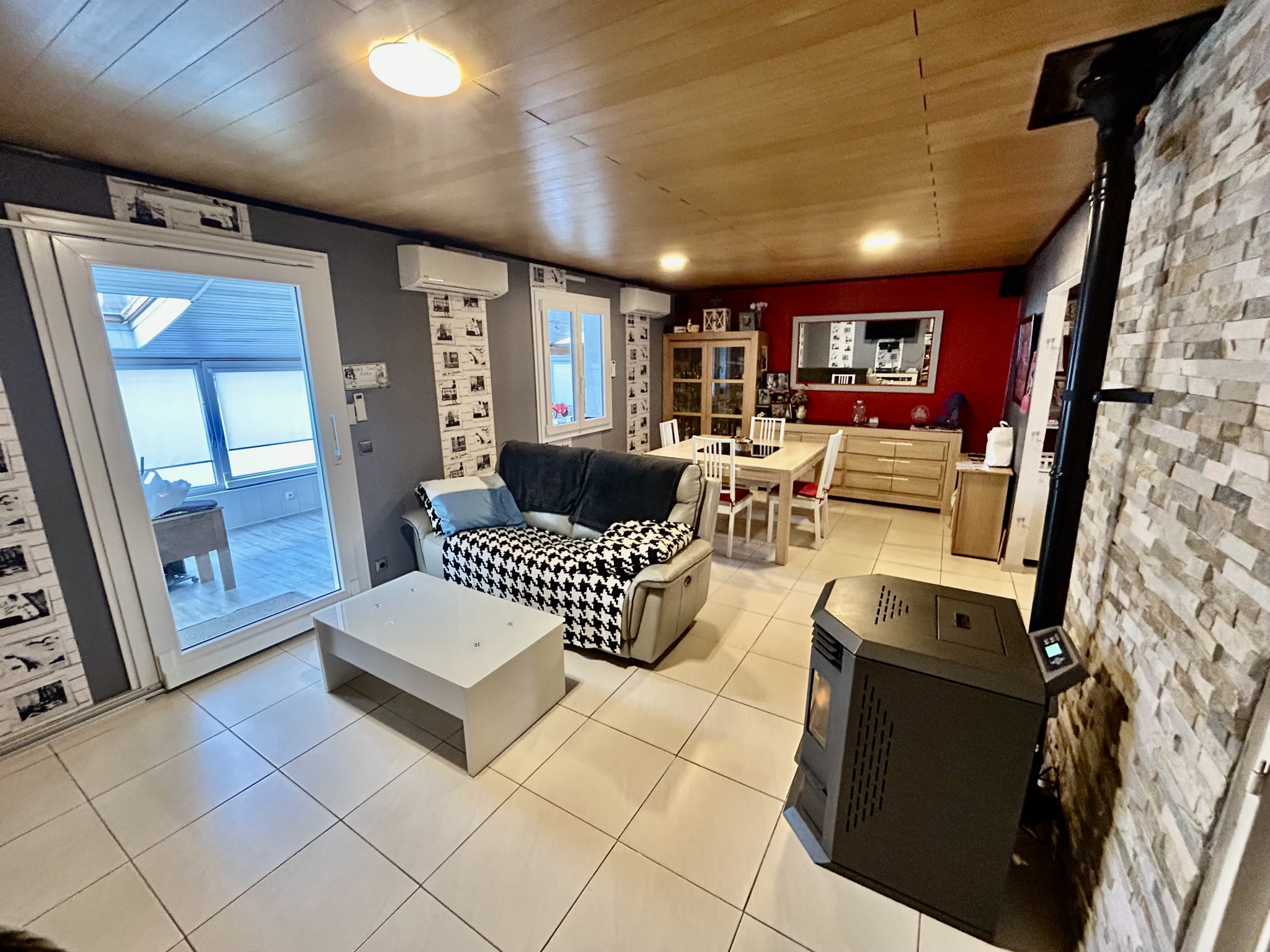 Un séjour de 21.9 m2 équipé d'un poêle à granules.