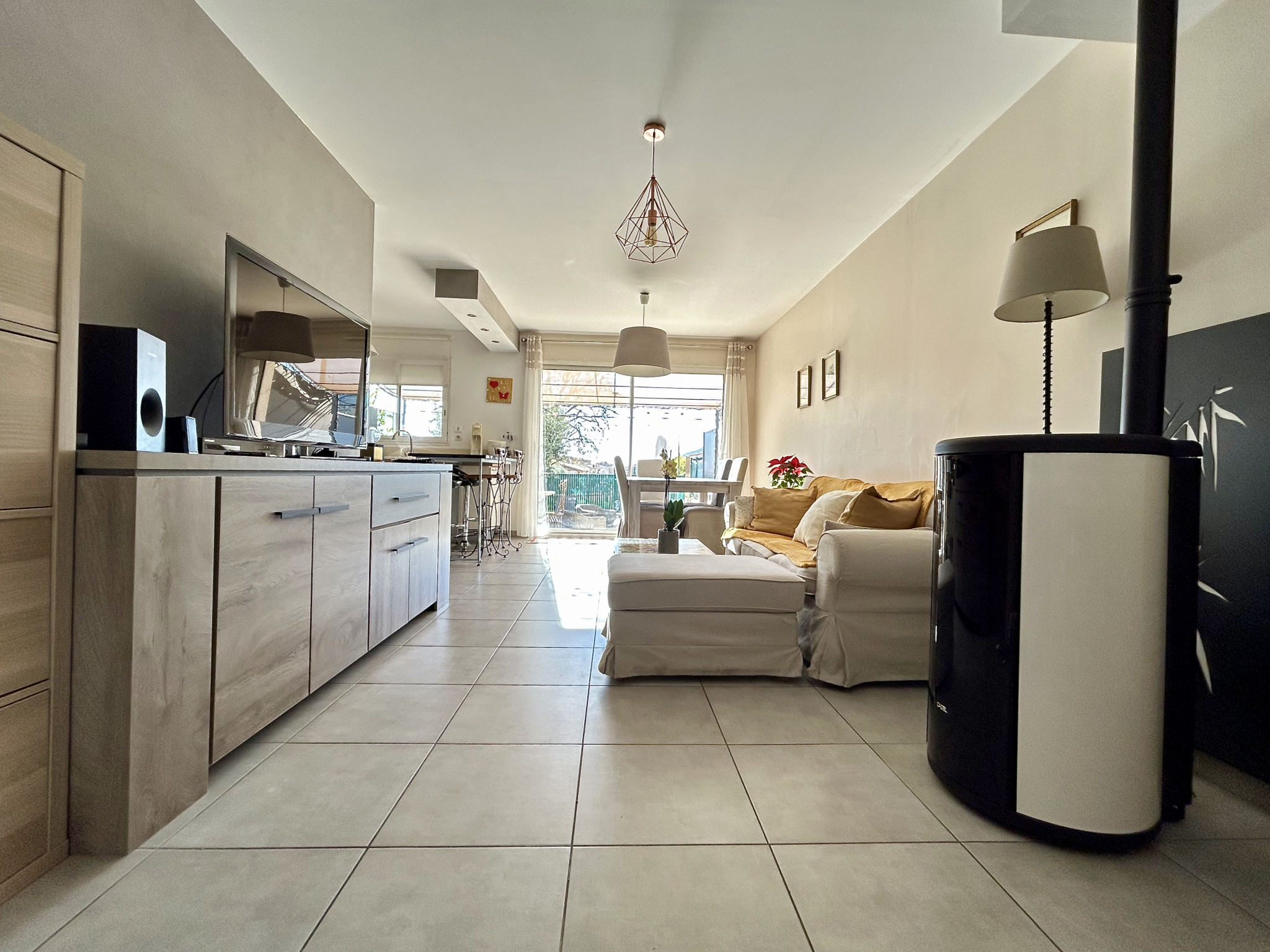 La villa d'environ 88m2 se compose d'un salon avec cheminée ouverte sur une salle à manger avec poêle à bois, une cuisine, deux cham...