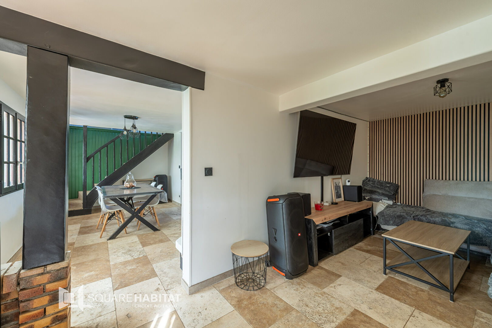 Au rez-de-chaussée : grande pièce de vie lumineuse de plus de 70 m², une chambre et un WC.