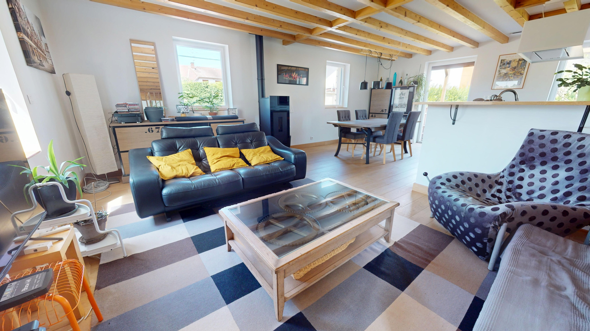 Vaste salon séjour avec poêle à bois et coin bureau. Très belle cuisine récente aménagée et équipée . Belle salle de douche. 3 chambres avec dressing dont une avec WC et lavabo. Panneaux ...