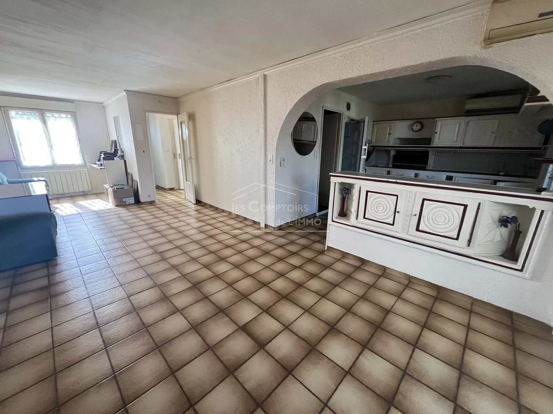 Cuisine aménagée et équipée (plaque, hotte, four, lave-vaisselle), dégagement, chambre, séjour, WC, salle de bains.