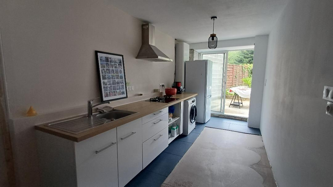 Au rdc , une pièce de vie avec cuisine ouverte , une chambre , salle d'eau et WC. A l'étage , une grande pièce à aménager...