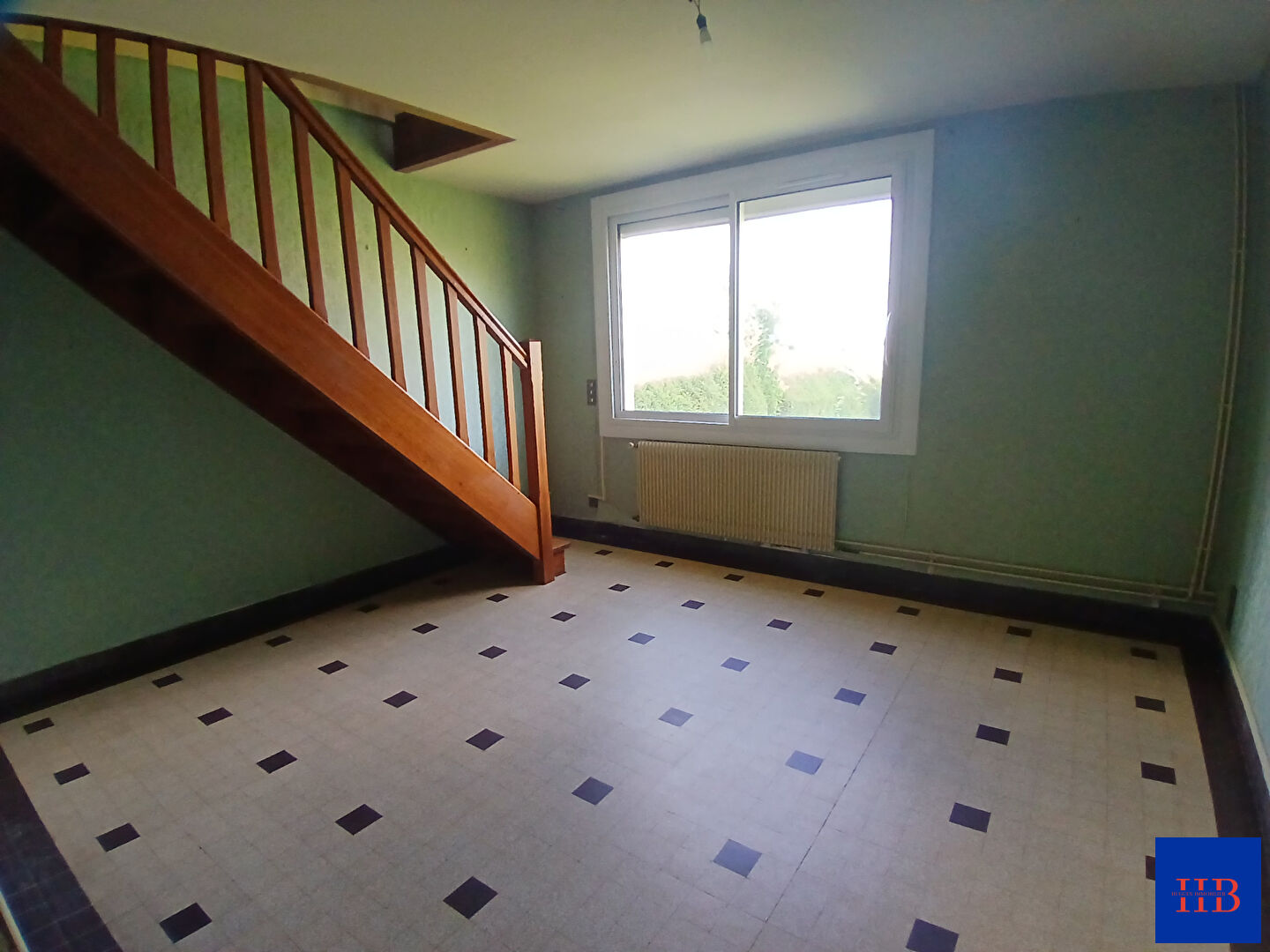 Accès rapide Caen, dans village avec école, maison mitoyenne de 76m² comprenant entrée, 2 chambres, sde, cuisine, séjour, à l'étage 1 grande chambre. Garage et très beau terrain clos arboré de 1202m² constructible. Travaux à prévoir.