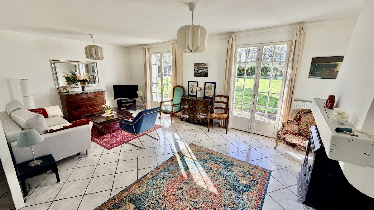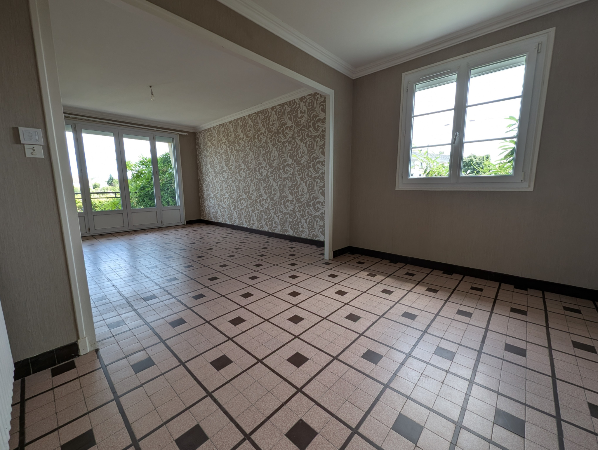 Cuisine équipée ouverte sur vaste espace de vie de 40 m² environ, dégagement 3 chambres, cellier, SDD, wc.